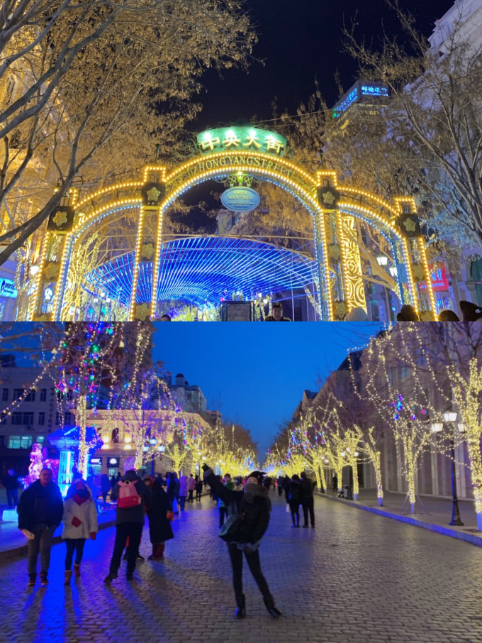 看完了大教堂,无意中又走回了中央大街,原来就一街之隔,两边复古建筑配上星光霓虹灯,有点美,但也司空见惯了,中央大街门头下都是游客们咔咔咔拍照中,我左挤右挤好不容易拍了这张勉强满意的门头照。