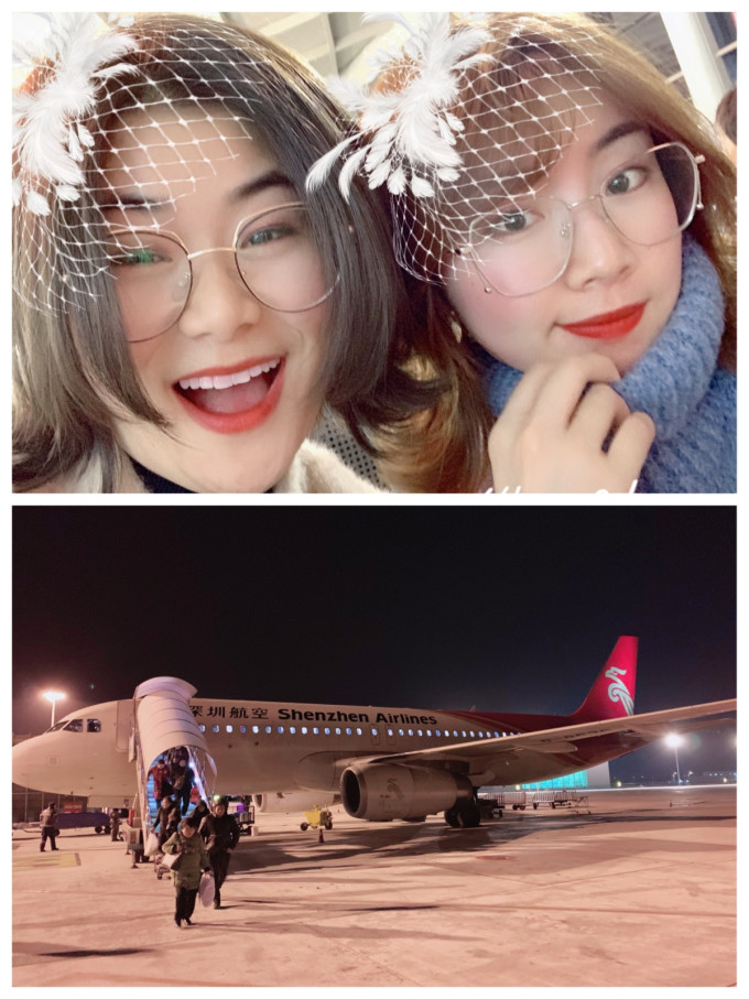 飞机晚点了40分钟,我们无聊到自拍。到哈尔滨太平国际机场已经23点38分,下飞机的那一刻,我忍不住的魔性笑起来,OMG,太特么透心凉啦,好在我穿了三条裤子,毛线衣、羽绒马甲、外套、长款棉袄,不至于太冷。网上预定的接我们去民宿的滴滴车也一直等着我们,到民宿已经十二点了,打开手机看了下天气,道里区-17度。