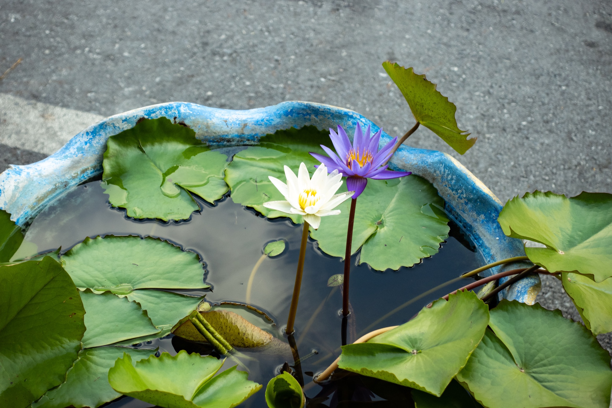 路边的水池里种着莲花..