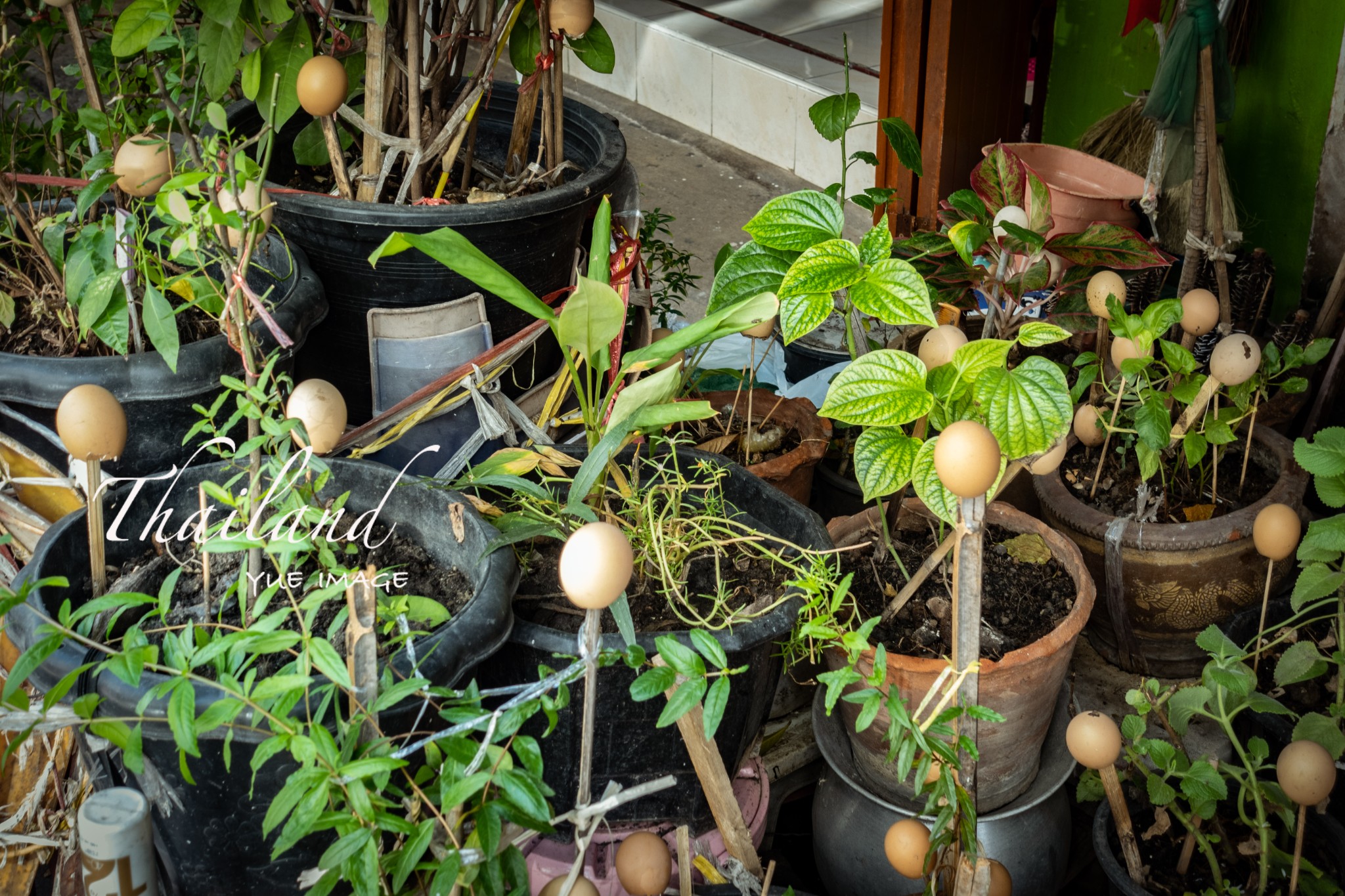 当地人把鸡蛋壳顶在竹竿上,据说是胃了让营养液流进土壤里。