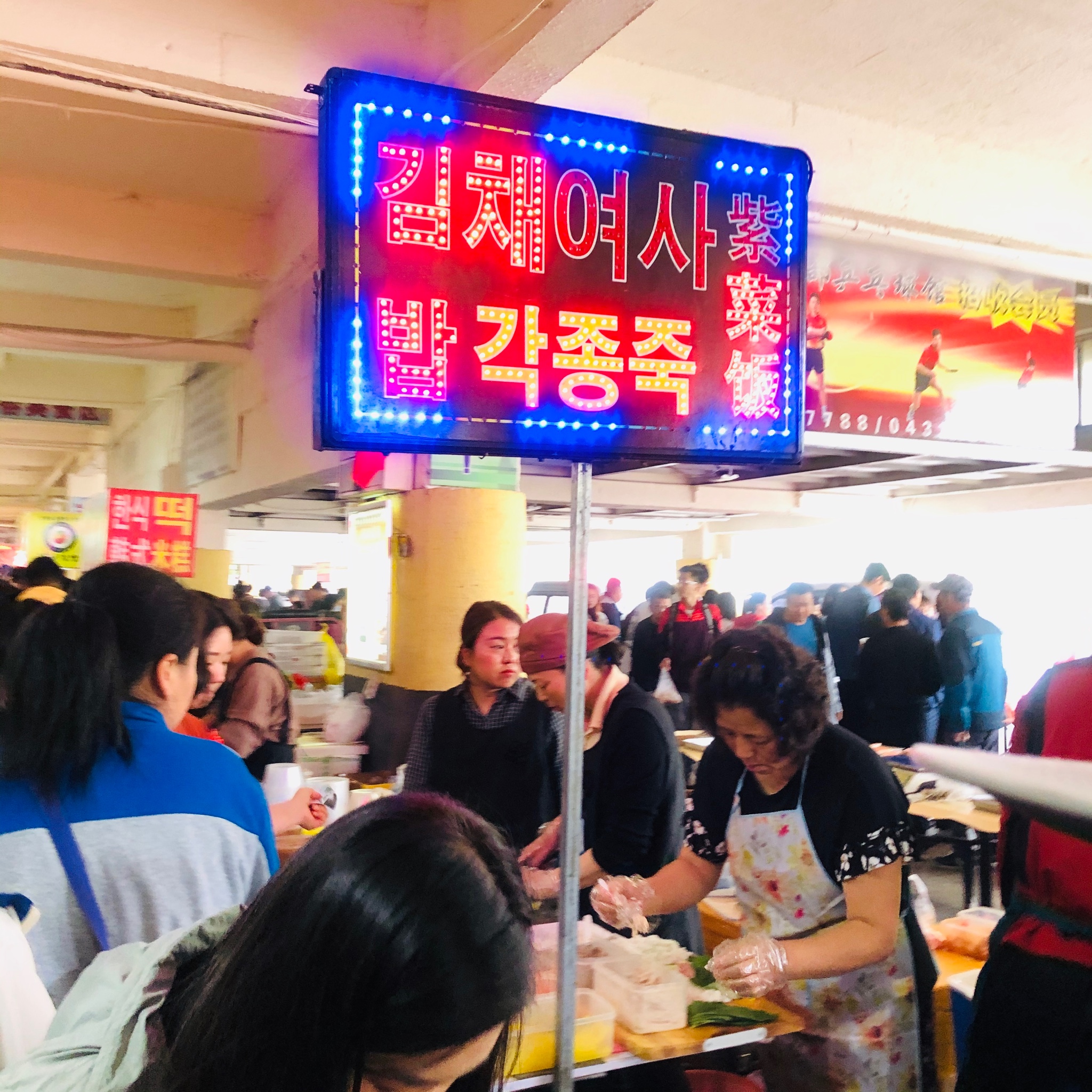 本来一早去水上市场我们就导航到西市场了,还以为是同一个市场,后来才知道是两个,不过离得不是很远,西市场是一栋大楼里卖什么的都有,像个批发市场,一层卖菜、各种延吉特产、明太鱼、现做的板筋、泡菜都特别丰富,楼上卖衣服、生活用品、床上用品啥的,种类特别多,来延吉采购一定不能错过这里。楼下有停车场,不过出去后很堵。