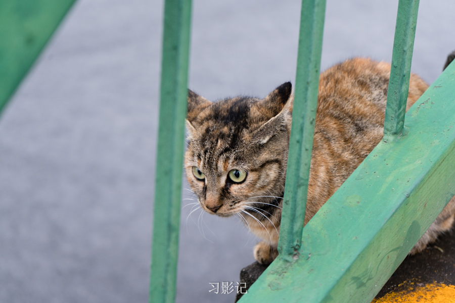 在大坝旁发现了一只猫,眼睛炯炯有神。