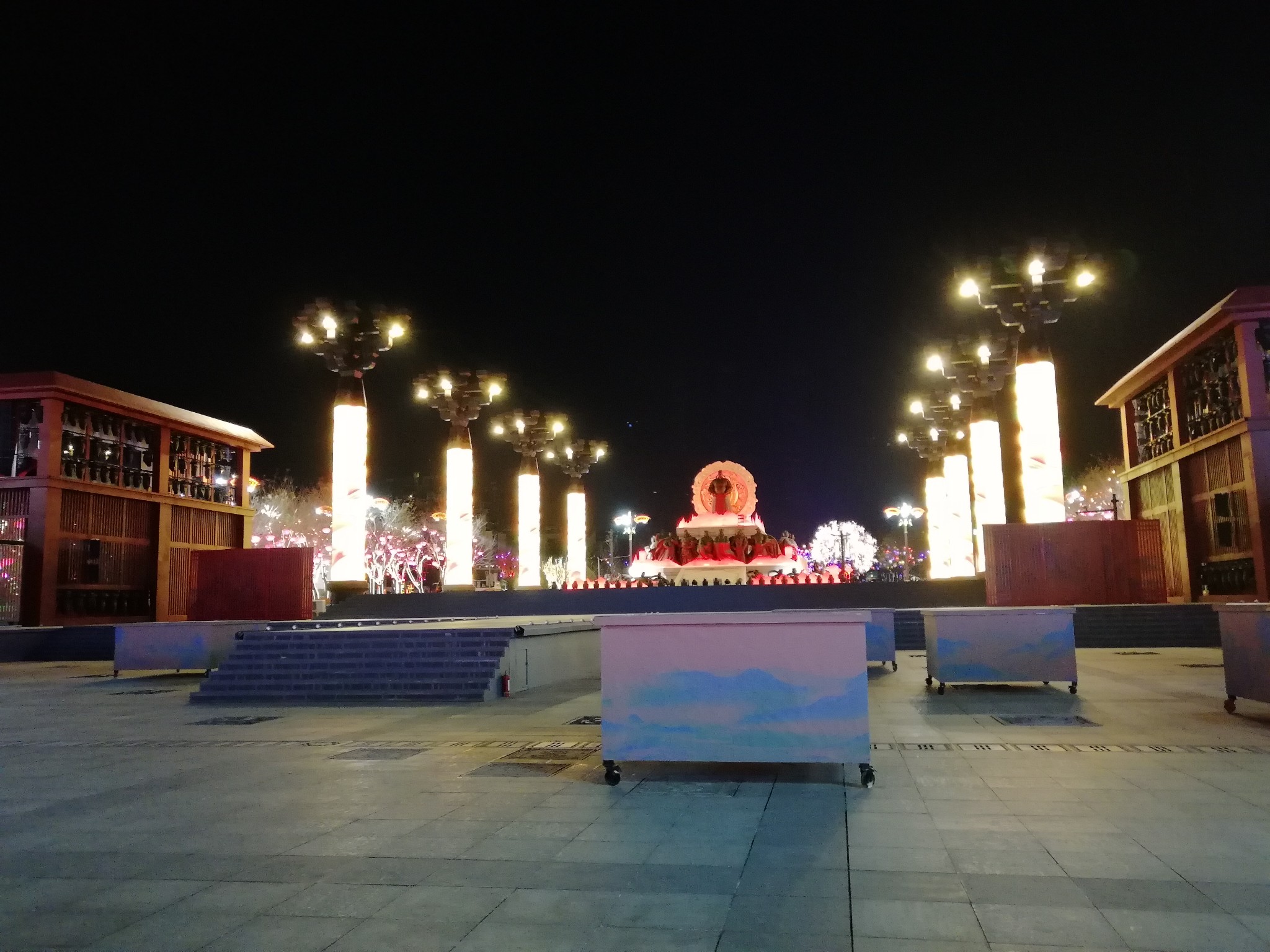 广场上8根朱红LED蟠龙柱高20米,柱头直径8.9米,柱身直径2米,东西两侧各有四柱,取意为四方、四极、四周、四海,与八数相合,意为四面八方、四通八达,完美地诠释了大唐不夜城的建筑美学,使得开元广场成为了一个露天宫殿,每位置身其中的游客仿佛回到鼎盛王朝。当LED灯柱在古城夜色中点亮,不夜城更加焕发出“不夜”之魅。