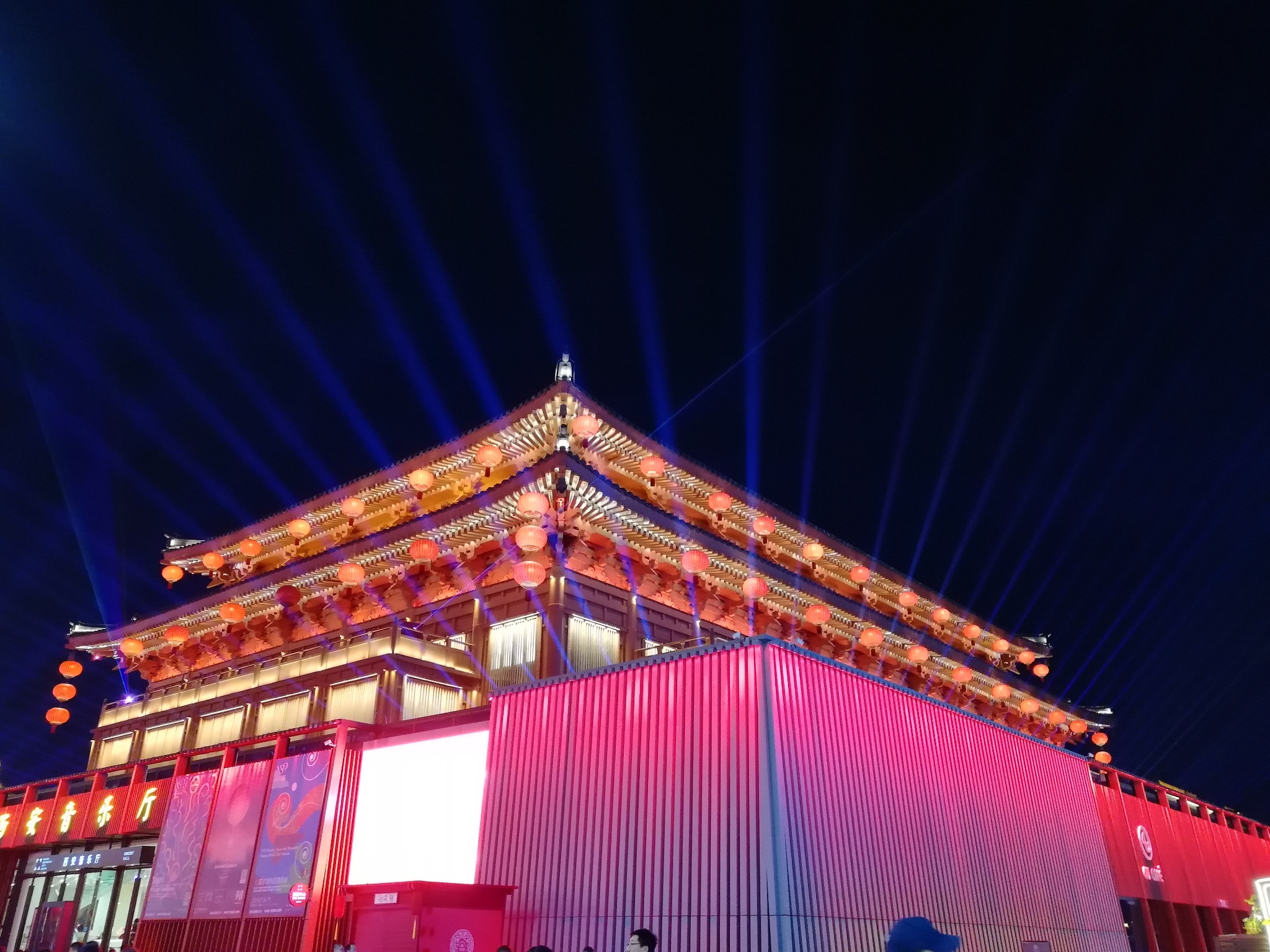 整个不夜城以大雁塔为依托,北起玄奘广场、南至唐城墙遗址公园、东西到达的都是慈恩路,反正非西即东!不夜城贯穿玄奘广场、贞观文化广场、开元庆典广场三个主题广场,拥有很多的仿唐街区和但是可以看到大气磅礴的西安音乐厅、西安大剧院、曲江电影城、陕西艺术家展廊四大文化建筑。在灯光的映衬下震撼无比。