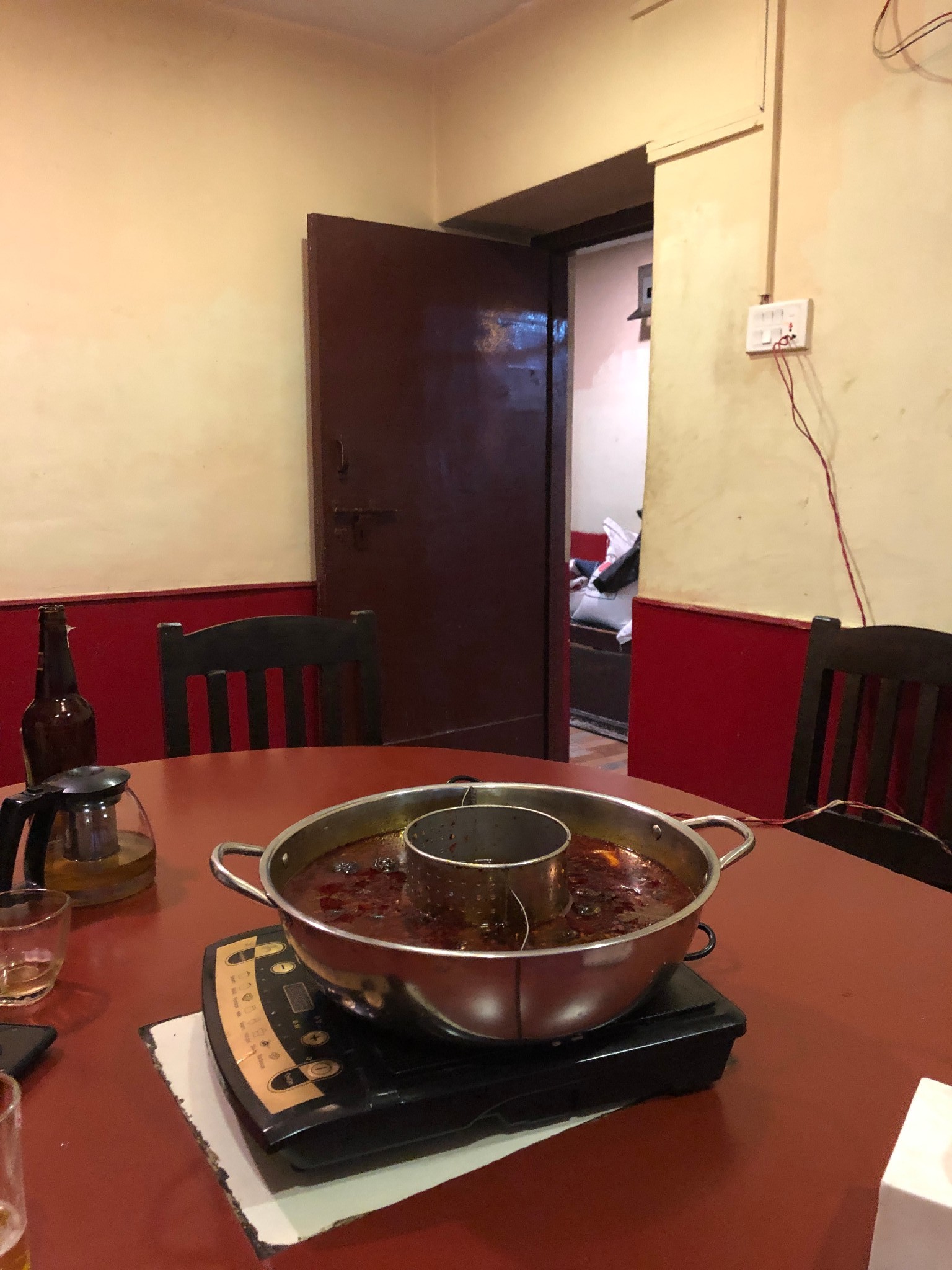 我还架不住同行朋友的强烈要求,一起去川菜馆吃了顿重庆火锅。味道竟然还不错,但电磁炉的电线是整个直接插进电源插座里,吃火锅的全程我都很怕会漏电。