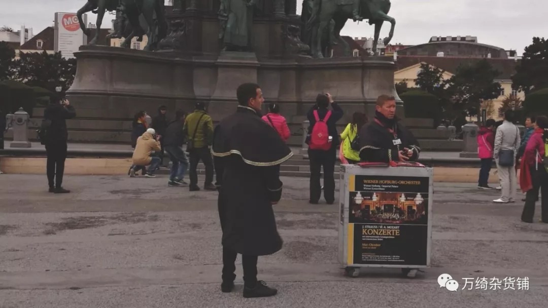 门口广场上的人很多,而维也纳的一个特别之处在于,你随时都可以看到宣传推销音乐会的人。他们会扮上莫扎特或者其他音乐家,在景区走来走去,跟游人搭话。被不同的人拉着问晚上有什么活动N次之后,我简直恨不得把已经订好的票贴在脸上以示立场。
