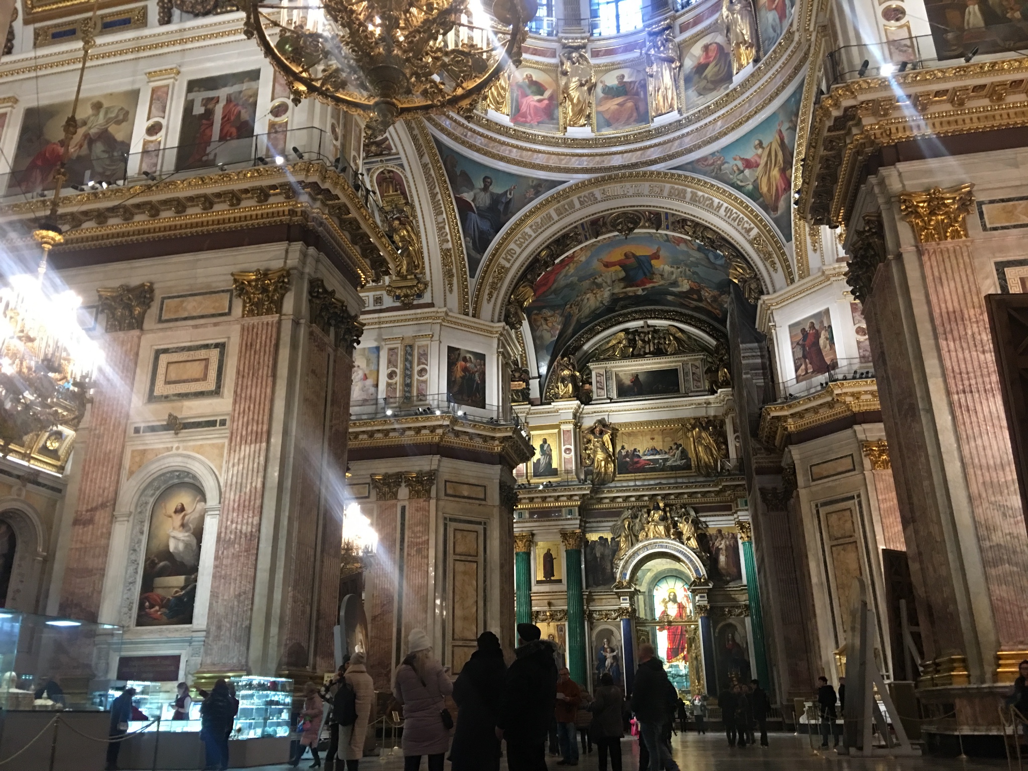 圣以撒大教堂是可以登顶的,但是那天是个阴天,我们决定等哪天天气好的时候再单独登顶,今天只是看看里面和外观就好了。教堂的票,在门口的自助售票机就可以买,进教堂里面参观的门票和登顶的票是分开的,检票口也不一样,一个在左边,一个在右边。