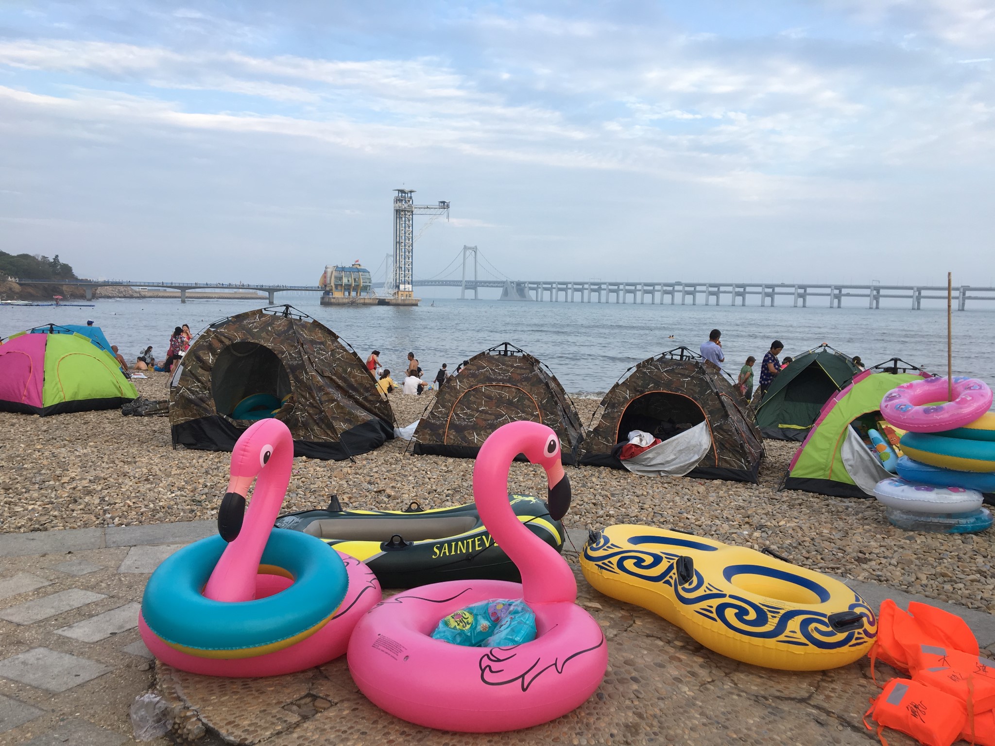 旅舍窗外,直接就是海景房,远处就是星海湾大桥,临近就是星海公园,所以位置来说是相当的不错,但是选择这里也是这个原因,附近大约走10分钟就有超市,超市位置可以问一下旅店老板,过马路过马路5分钟就可以到达海边,旅舍可以租借泳圈和帐篷,很是方便~