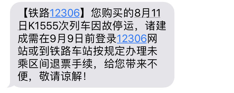 当我一切都安顿完,拉开窗帘的那一刻,整个人都惊呆了。台风“利奇马”它来了!狂风暴雨,雨点打在窗户上的声音沙沙作响!我自知此次行程已经基本毁掉了,还好有先见之明,事先购买了第二天的K1555次列车,打算在南京混迹一日,于第二天的凌晨2点上车回上海,还可以在车上睡一觉。可这时,我收到了一则短信,K1555因故停运?!