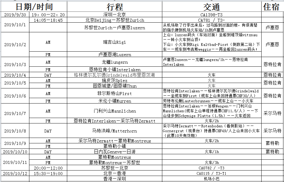 上图是我们11天行程的整个路线,我们对城市安排比较少,多半时间都是安排阿尔卑斯山脉环绕的地区,图中所有标记的地方都是我们去过的,后面正文都有图片参考,也是我个人觉得安排的相对完美的路线;具体的行程安排如下图: