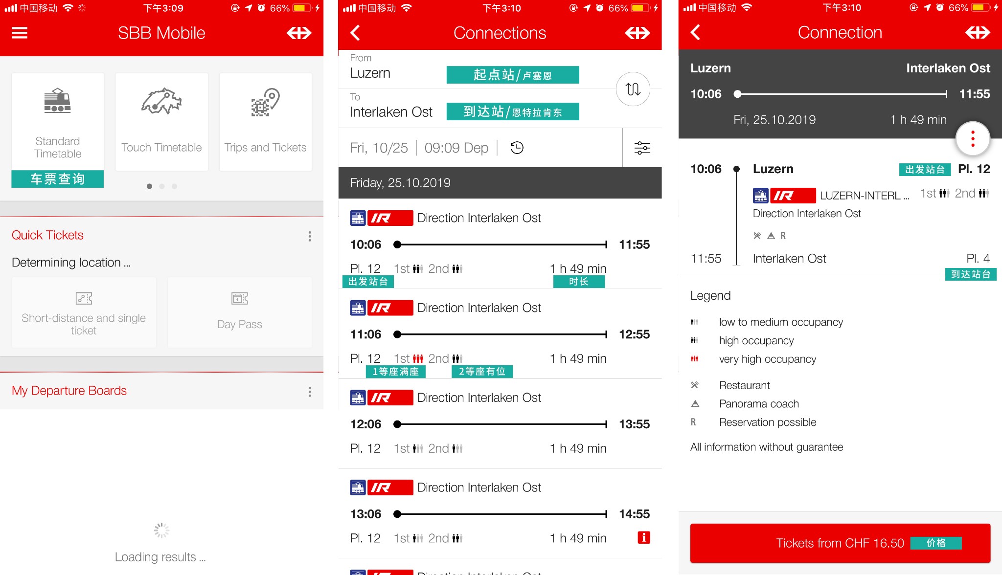 加强版的瑞士12306;在瑞士基本所有交通(火车,船,公车,缆车)都可以靠这个软件查询到,每个地方之间均为30分钟或1小时一班,时间也特别的准时,在瑞士大部分交通工具都是火车,瑞士的火车里面就像我们国内的地铁及高铁的整合,不用安检,车到站上车就走,又类似公交站乘车方式;整个瑞士的大部分城市及景点都能到达,如有购买瑞士通票的伙伴,在瑞士坐火车,不用提前去车站,你看几点的车,大概提前两三分钟左右到站台就行;