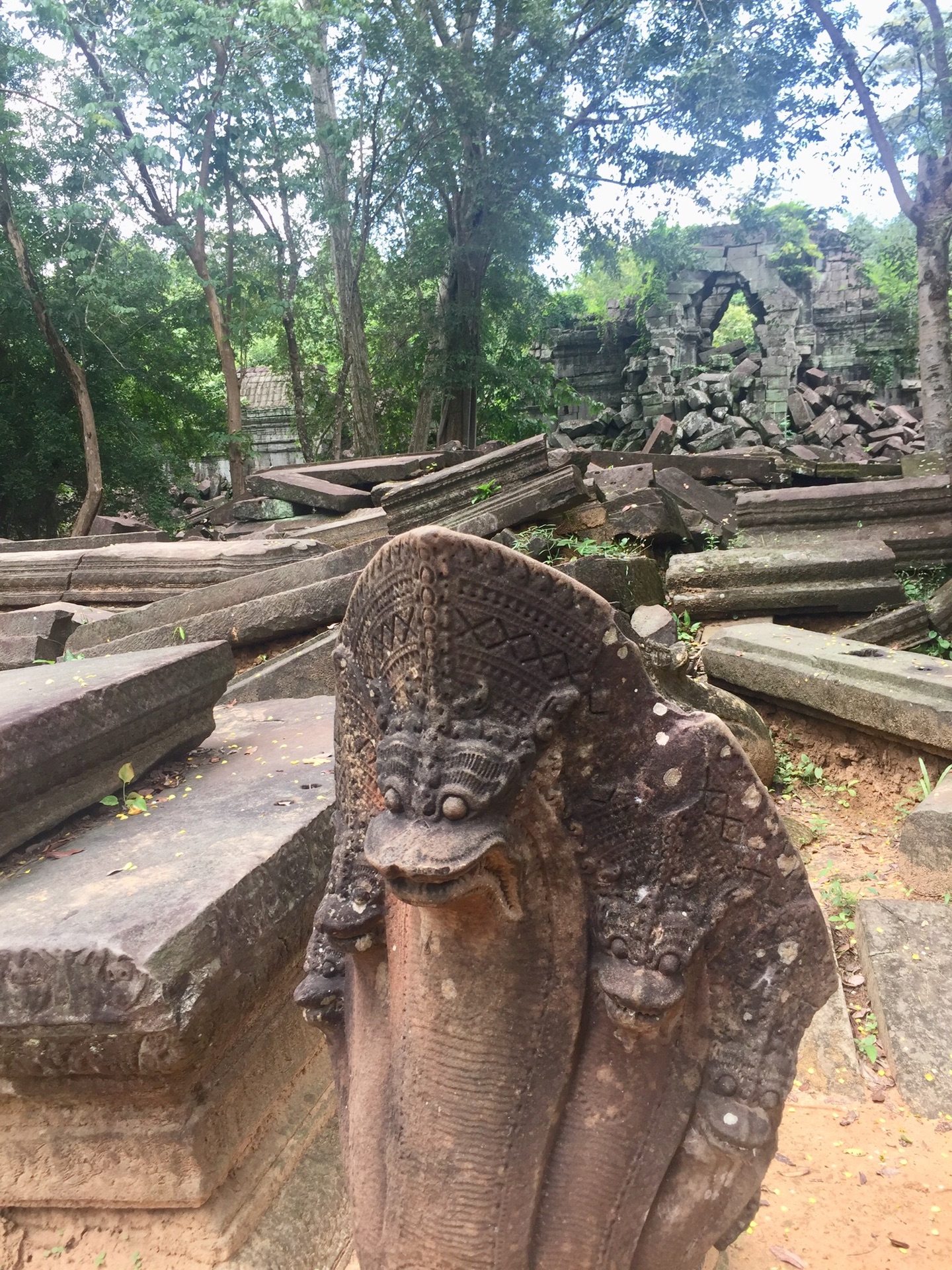 柬埔寨信奉佛教,视蛇为龙,每个寺庙都有蛇头的雕像。每个上点规模的古迹大门前都有七头蛇那迦的雕塑,那迦是保护城市风调雨顺的。所以,在一个佛系国家,处处都能看到象征意义的标志,是一种很正常的现象……