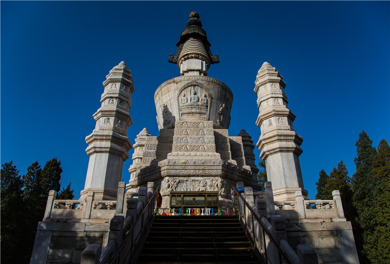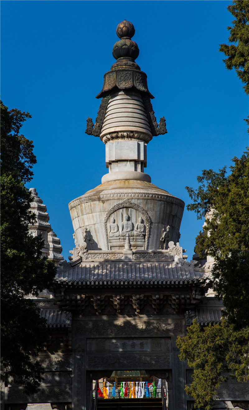 其中,主塔高约15米,塔基为八角束腰式,由八角形的须弥座承托塔身。须弥座饰以莲花、卷草、云彩等纹饰,座的八面浮雕为佛教故事,八个拐角各浮雕有一尊很大的藏族力士像,他们手擎宝塔,气势雄伟,犷悍淳朴,正南面雕刻有一个佛龛,龛内浮雕着三世佛。塔顶为铜制鎏金双层莲花、相轮、宝瓶盖顶。主塔的四角各有一座八角形塔式经幢,高7米,各分五层,每层供有八座佛像,雕刻精美,风格独特。经幢与主塔共同组成金刚宝座式塔。