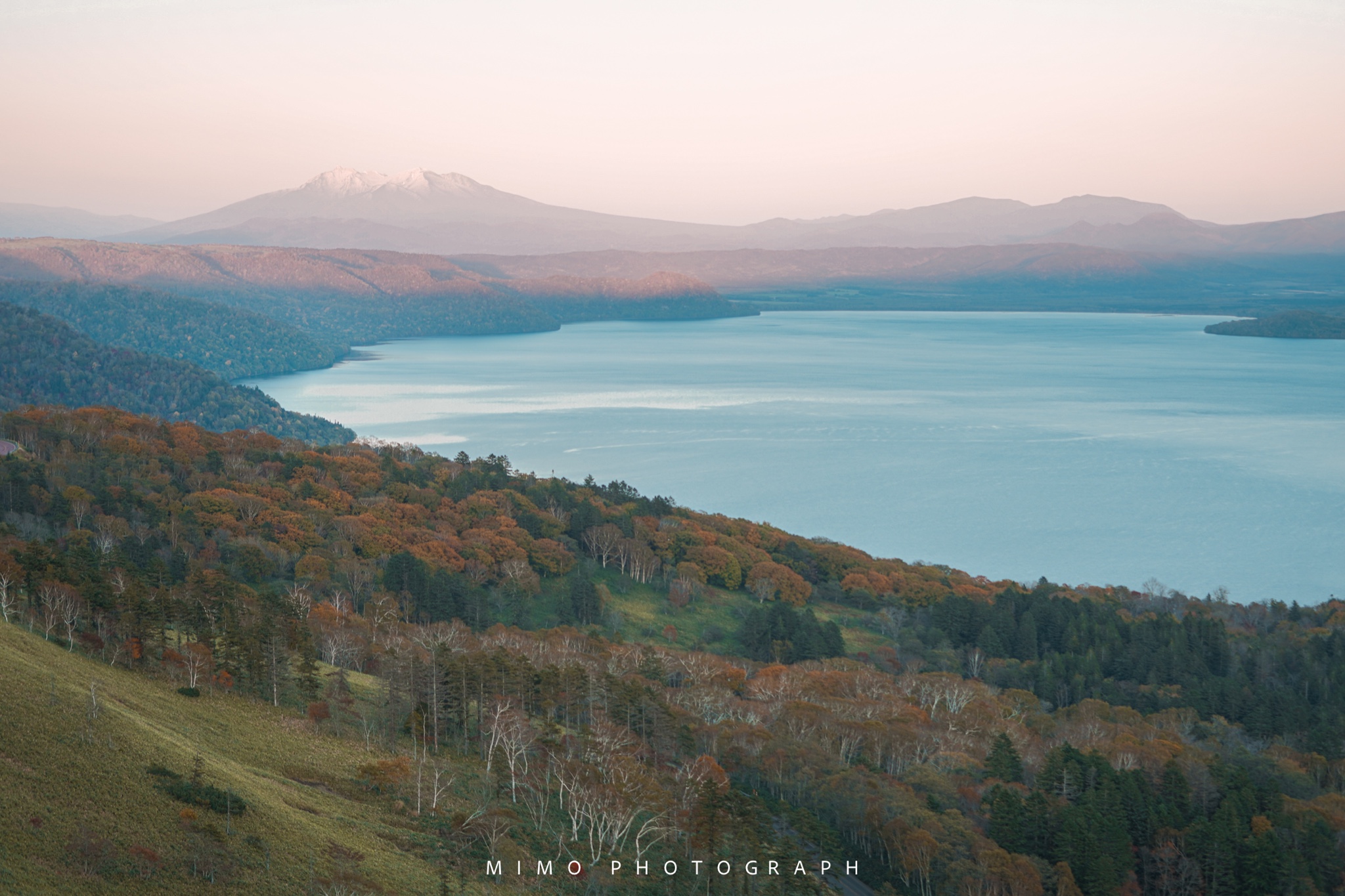 屈斜路湖的黄昏被覆上一层淡淡的粉色,平静而又美丽。