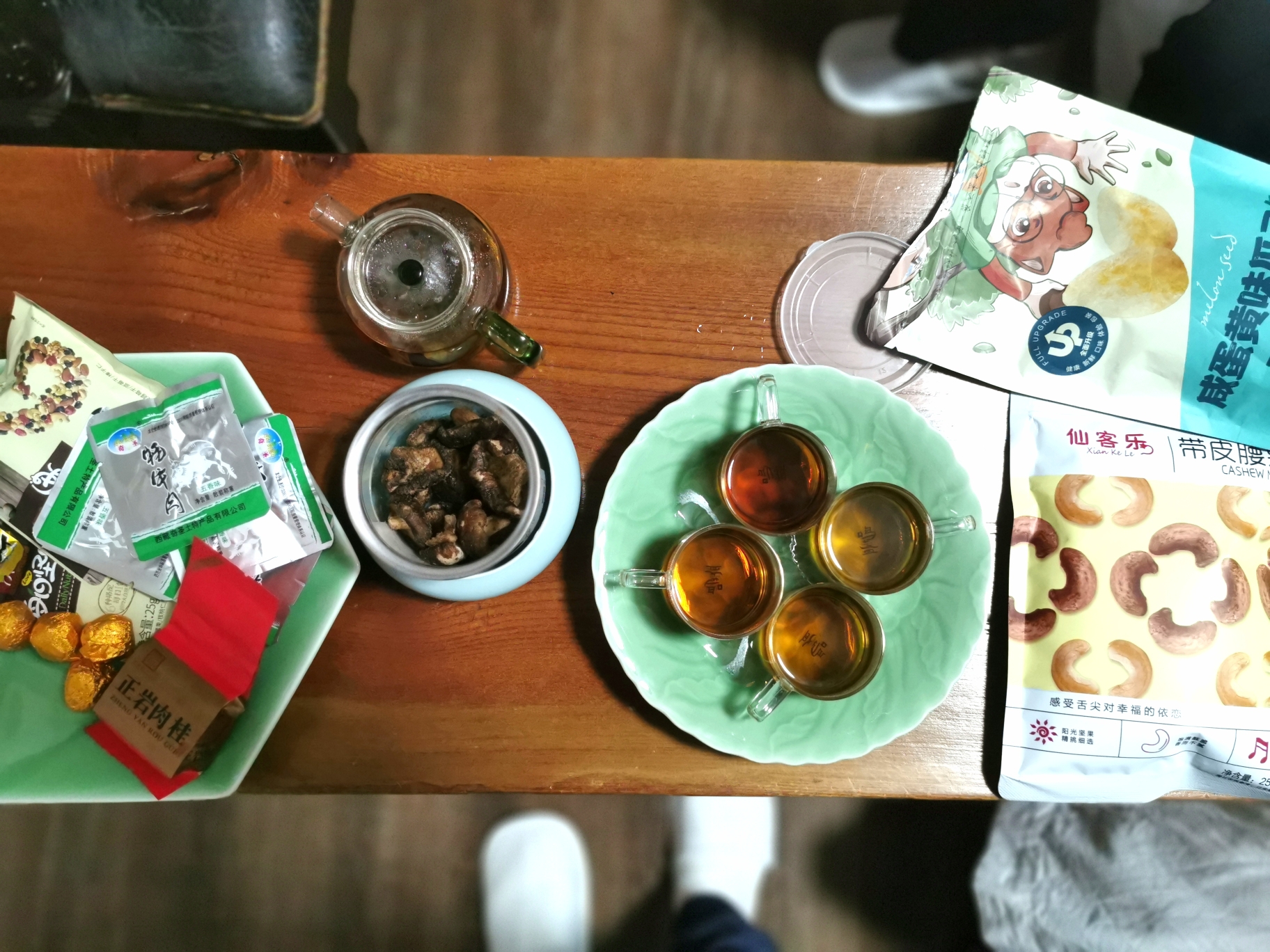 吃过晚饭,摆上饭前逛客栈邻家小店买来的瓷具,梅同学自带的茶具和好茶,大家喝茶聊天,好不开心!