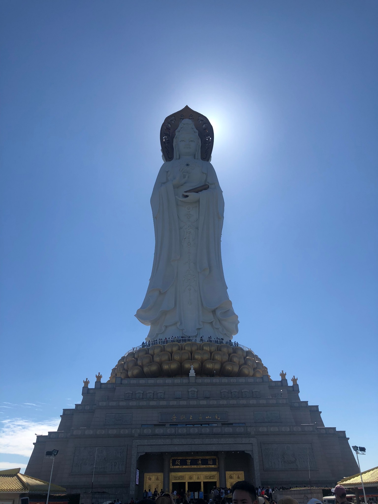 观音座下那个地儿是可以上去的,是可以抱佛脚的,就是上去要排会队伍,并且上面风很大,能把人吹成个傻子。