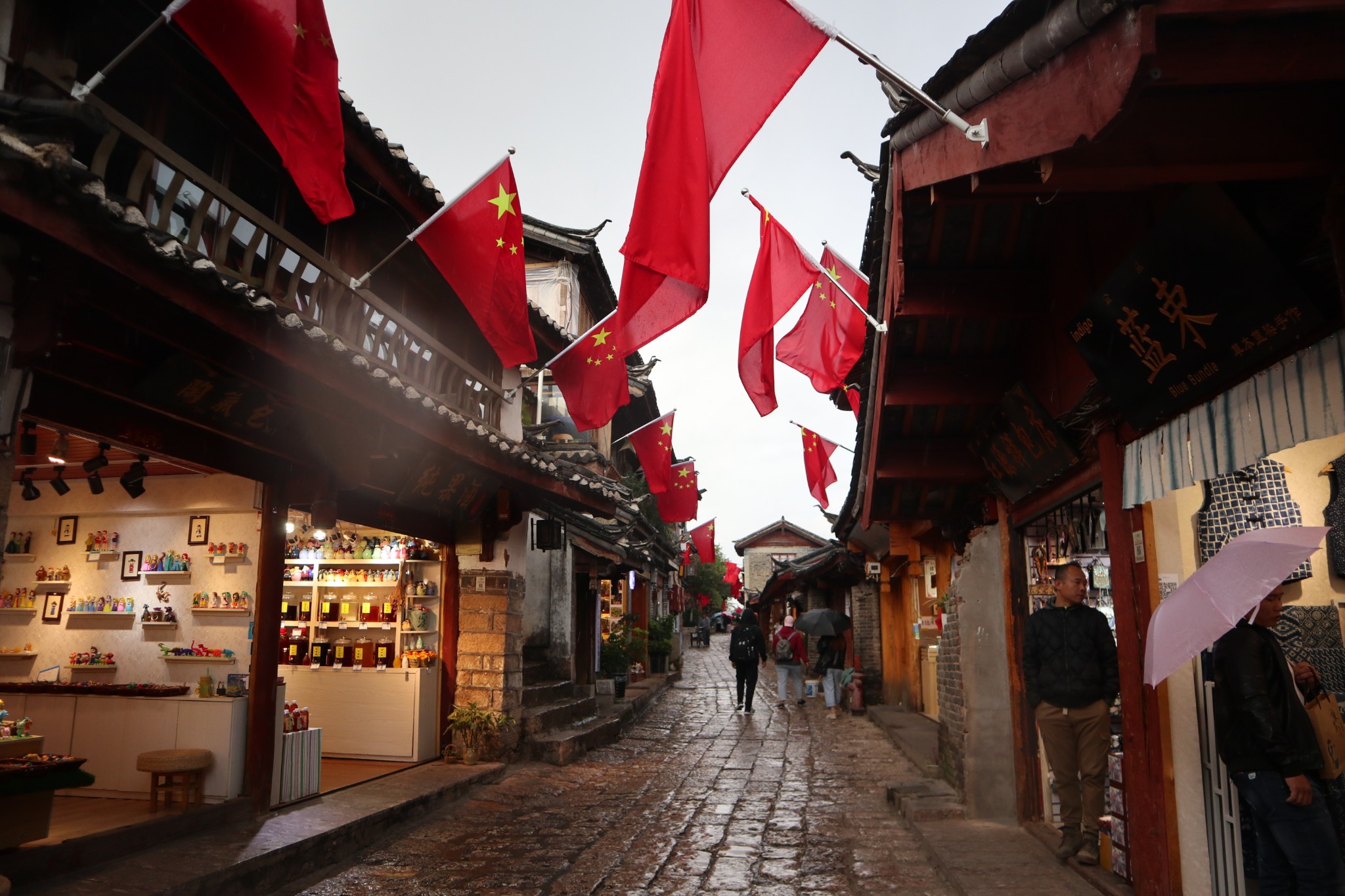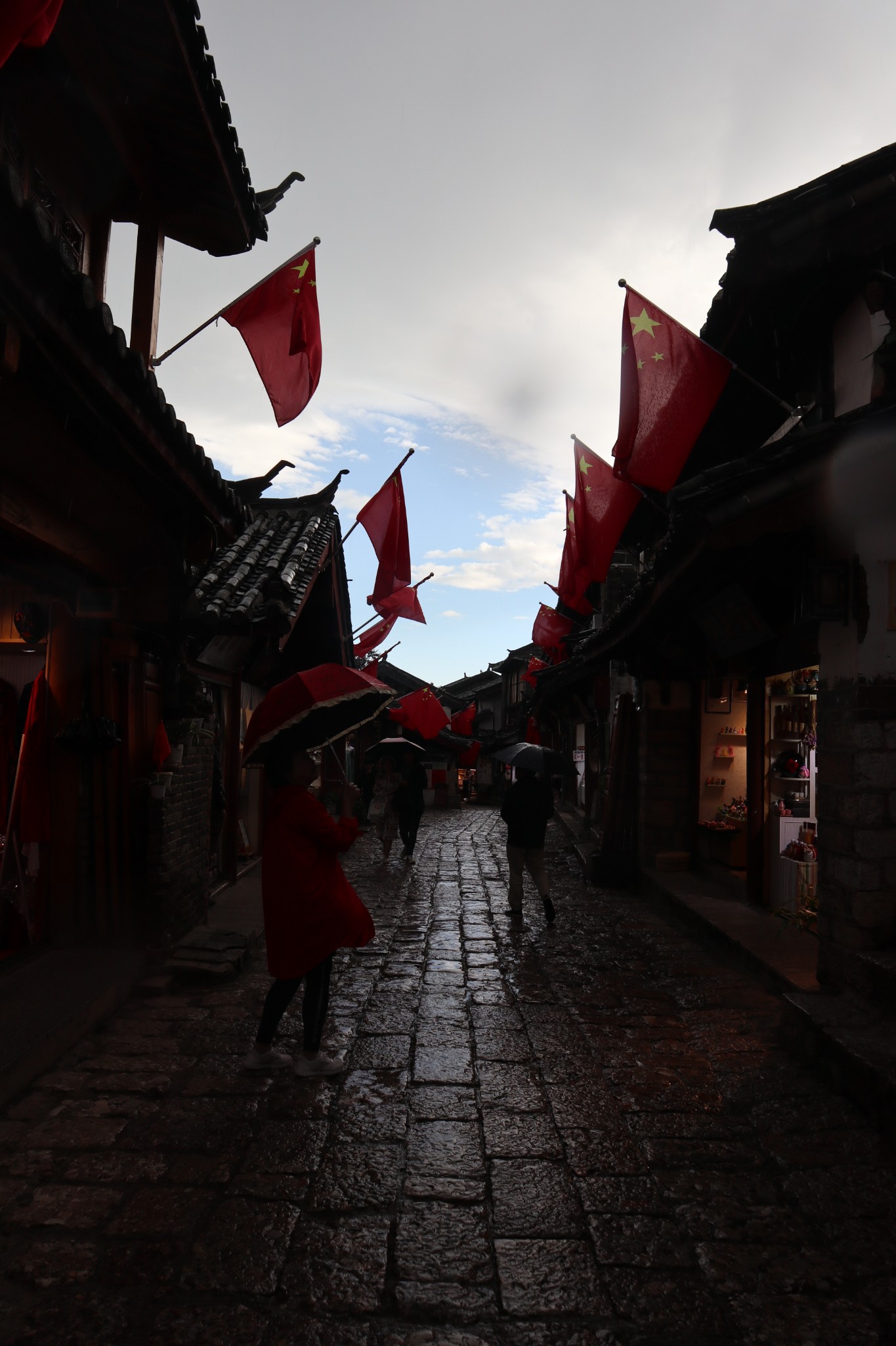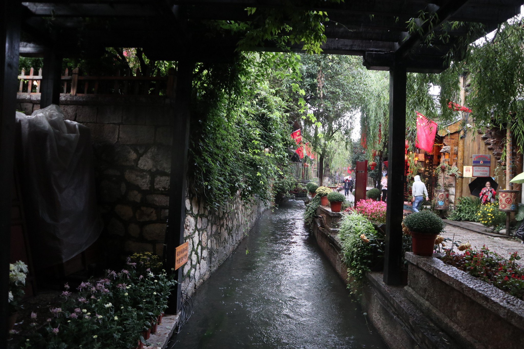 稍作休息,我们开始了正式的丽江旅程。云南的天气说变就变,这次眼见为实了,从民宿出来还晴空万里,才几百米走到古镇的功夫,突然电闪雷鸣,下起了中雨