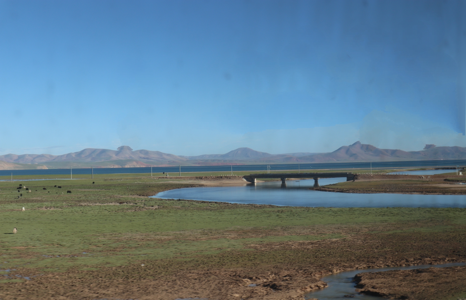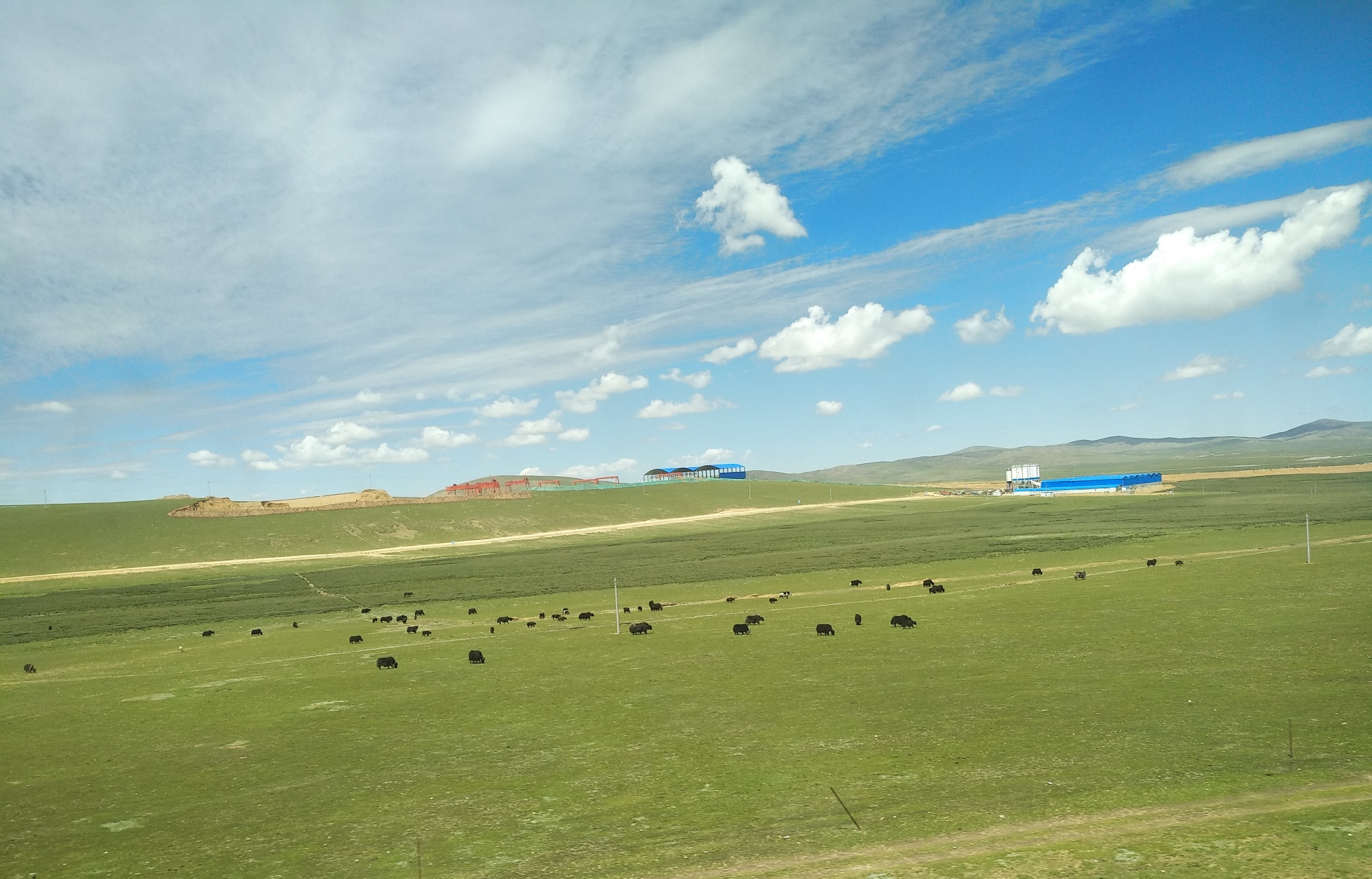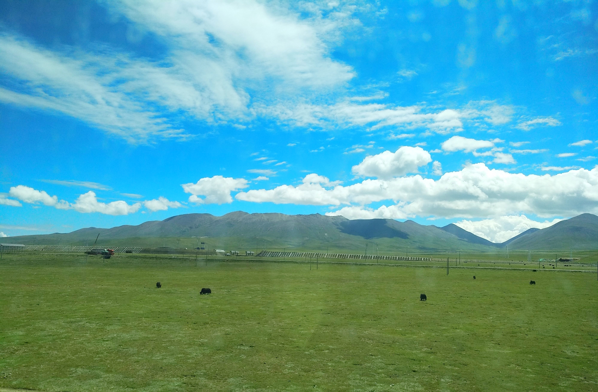 此时列车已经到达西藏那曲地区的那曲草原,高原的蓝天白云,沿途的成群的牛羊,牦牛,绿地组成了一副流动的锦缎画。眼睛看不够,大家纷纷举起相机记录下来。