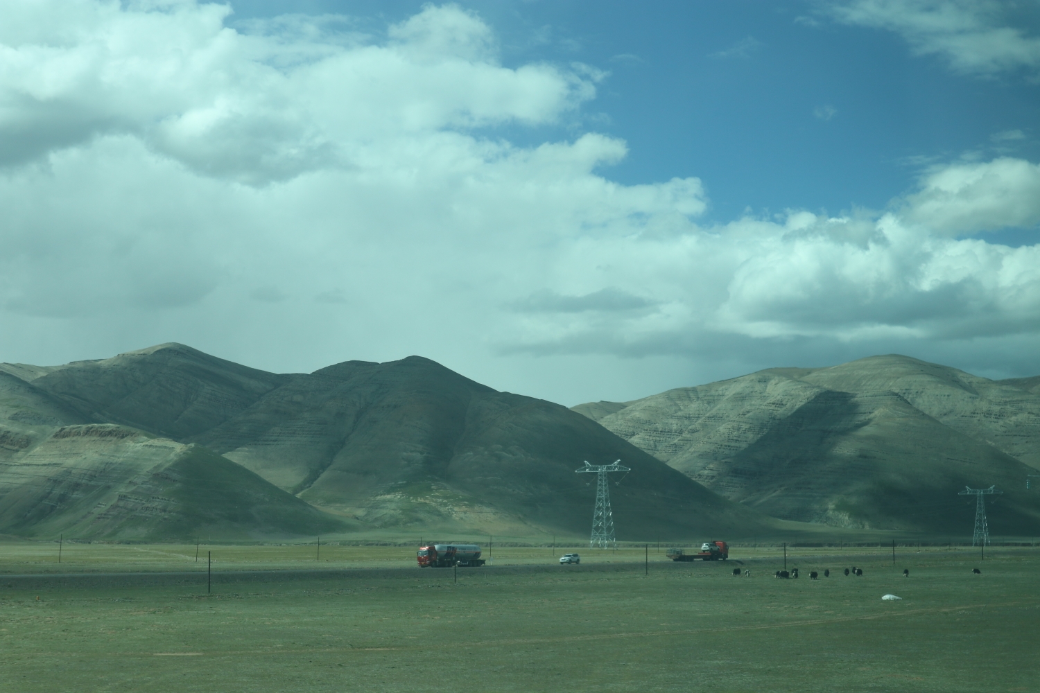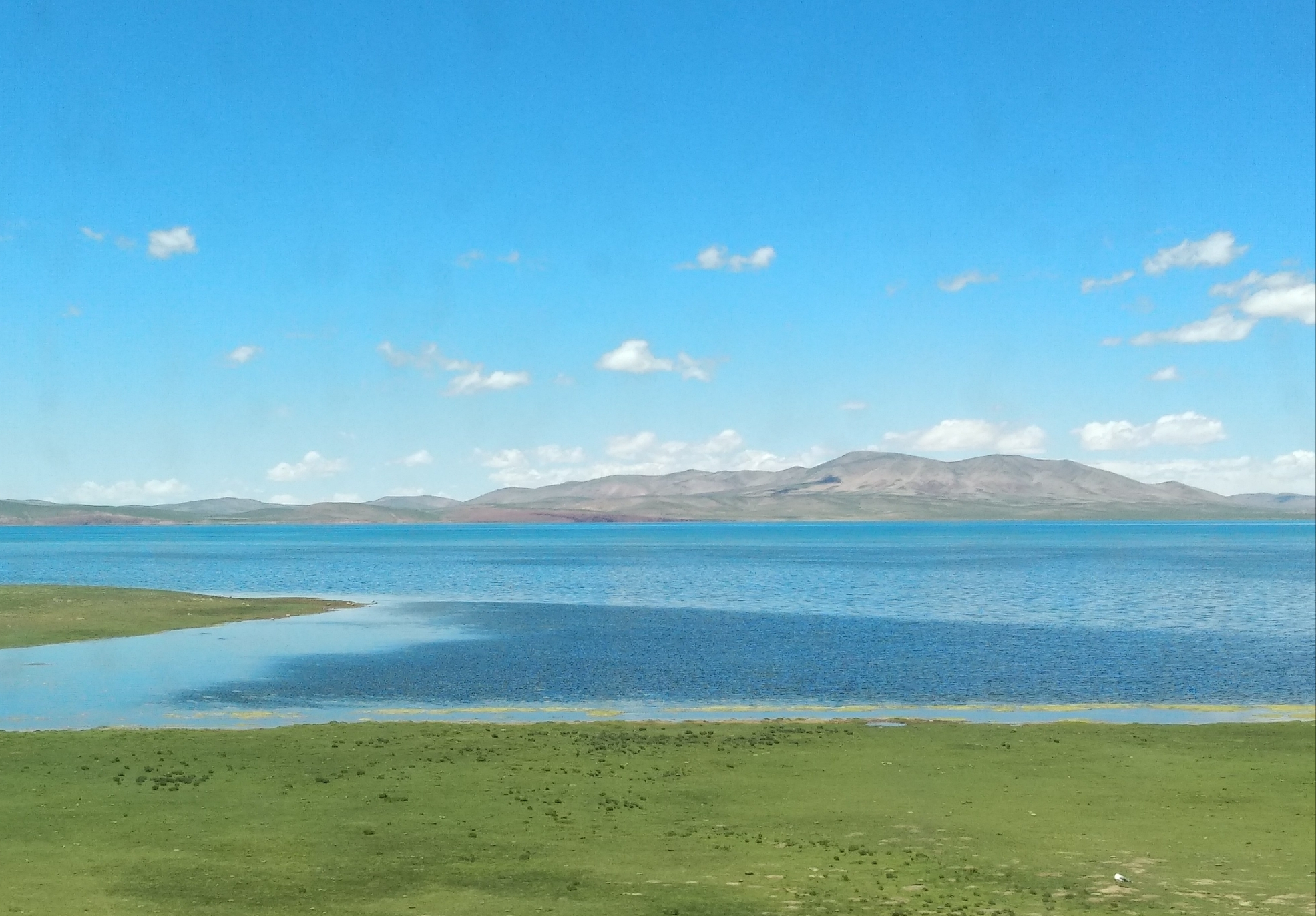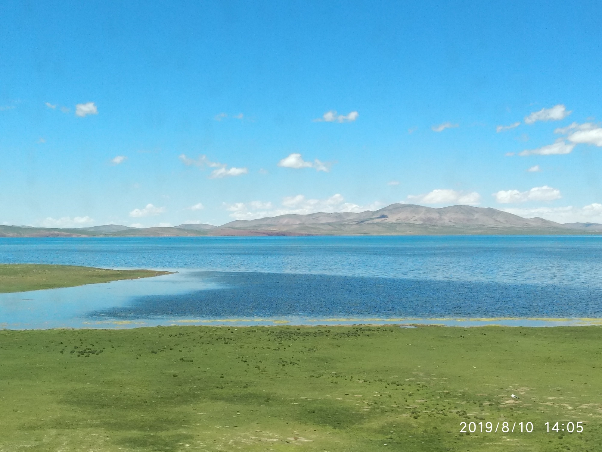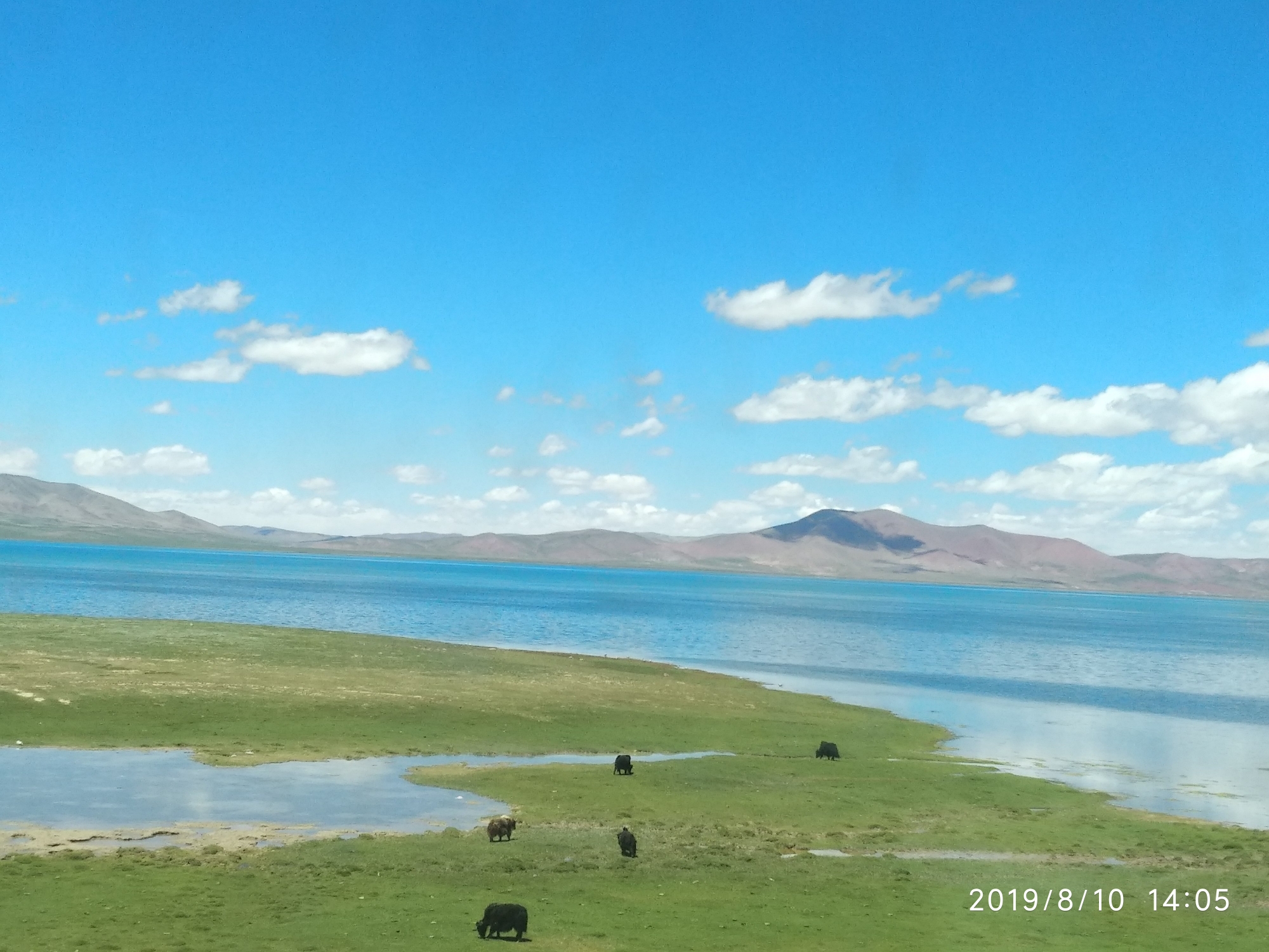 此时列车已经到达西藏那曲地区的那曲草原,高原的蓝天白云,沿途的成群的牛羊,牦牛,绿地组成了一副流动的锦缎画。眼睛看不够,大家纷纷举起相机记录下来。