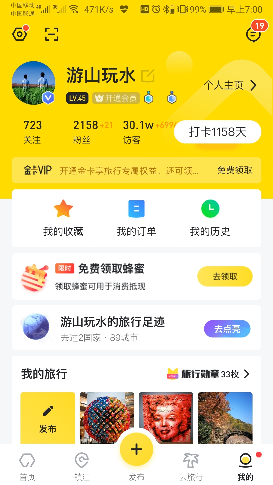 进马蜂窝已有2300多天,打卡也有1100多天。打卡中间还断了二次,都打了一年多,外出游玩因时差和坐飞机而耽误打卡,中断后再重新开始。