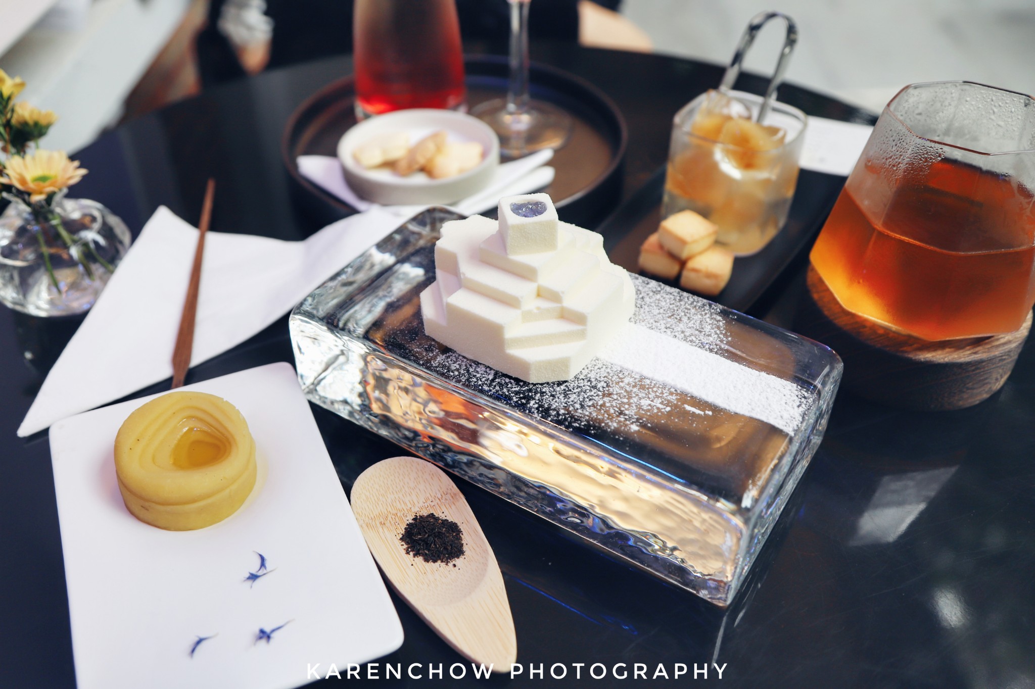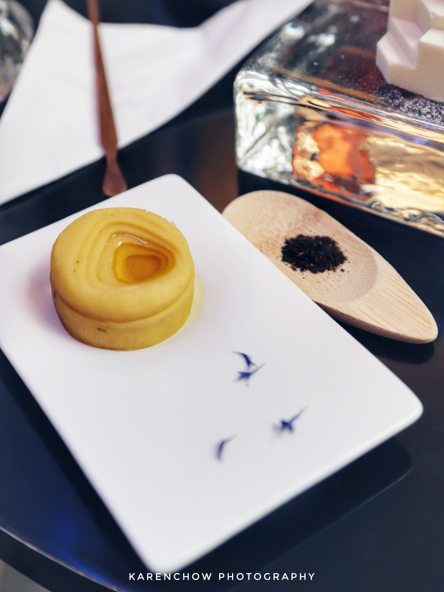 完美的还原了贝聿铭多哈伊斯兰艺术博物馆建筑,顶部是蓝色琥珀糖,之所以用水晶座是因为建筑建在水上,从而更完美的还原。其味道是清香的豆腐味,一点不甜腻,口感顺滑,非常好吃,同样可用惊艳形容。