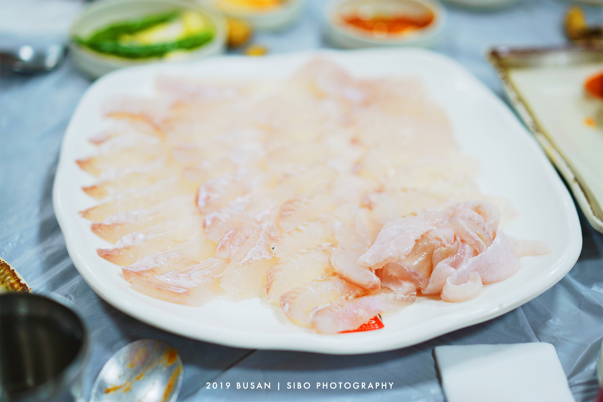 釜山特色的生鱼片刺身,份量很足,但这到底是什么鱼肉,无论是菜单上的韩文还是大妈热情的韩语介绍,都没令我们整明白。