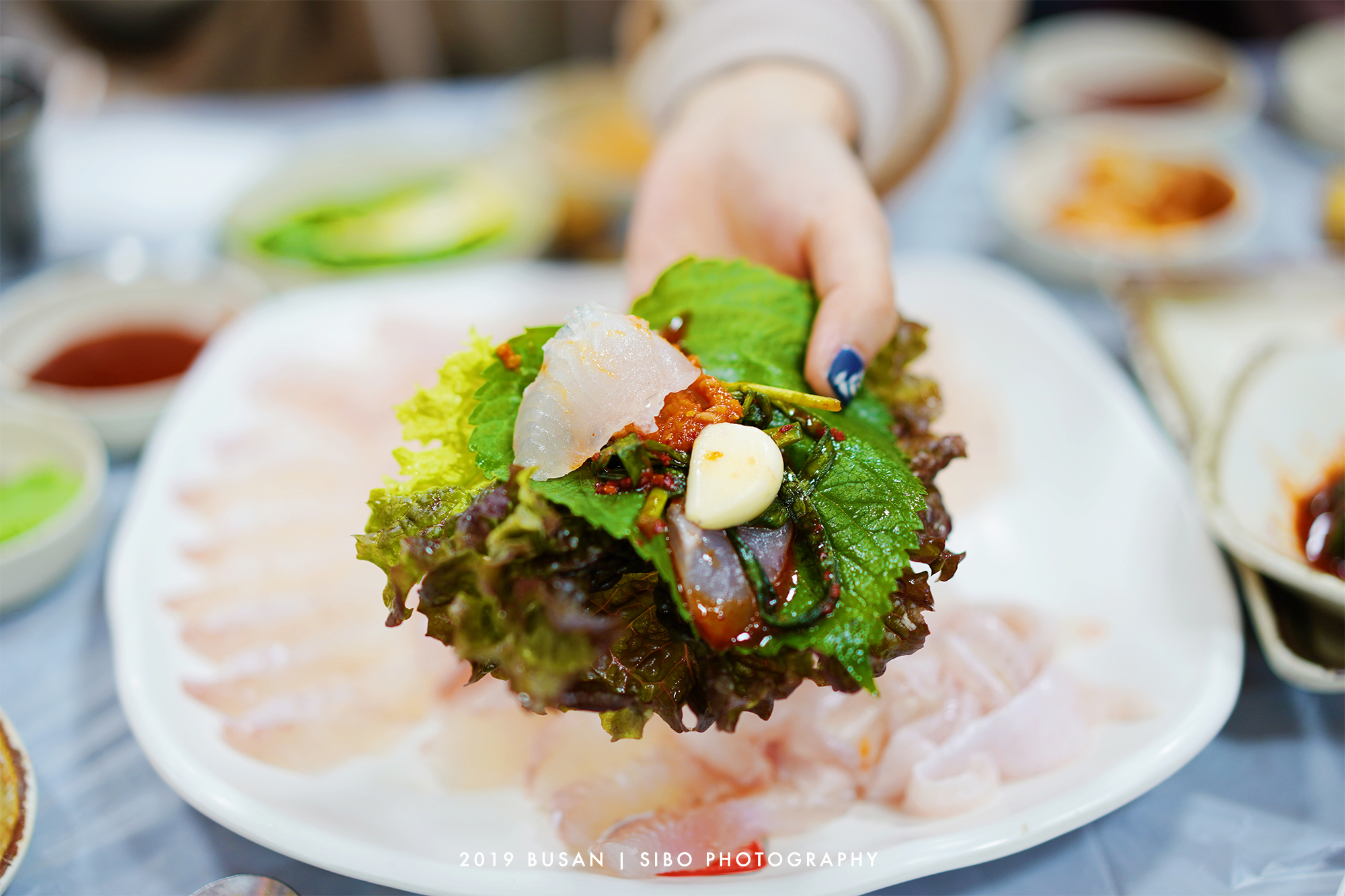 大妈很热心的教我们釜山本地吃生鱼片的方式:先以生菜打底,再盖一片紫苏叶,然后一块鱼肉,一点泡菜和大蒜,最后涂抹上自制辣酱,包在一起放进嘴里,生鱼片的鲜嫩配上紫苏叶的清香,一点腥味都没有,特别赞!