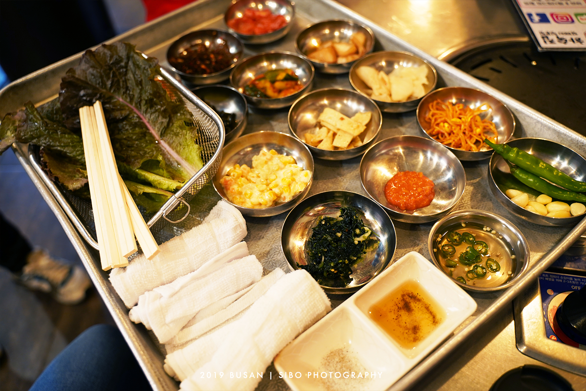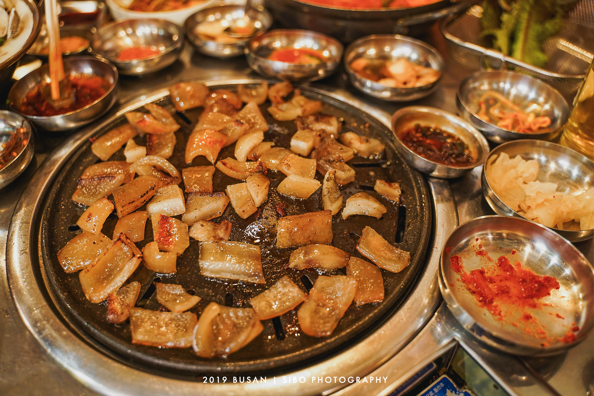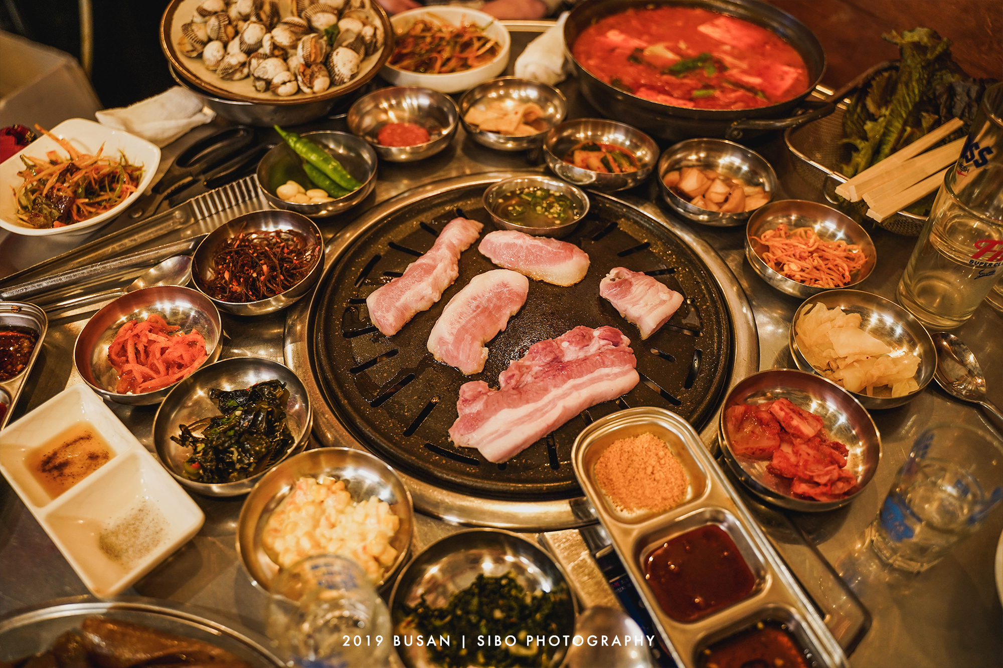 聊韩国美食,绝对避不开的就是在铁盘上烤得滋滋作响的五花肉,还有那一放上烤炉就香味四溢的油花,来釜山怎么能不吃烤肉!我们这次没有去味赞王盐烤肉、伍班长等攻略必写的人气网红店,而是在一名釜山本地人推荐下去了位于海云台的烤肉店하숙집,可能确实太本地,所以连店名的中文翻译都没有,三个字谷歌直译是寄宿房。地址:90 Centum jungang-ro Haeundae-gu Busan。
