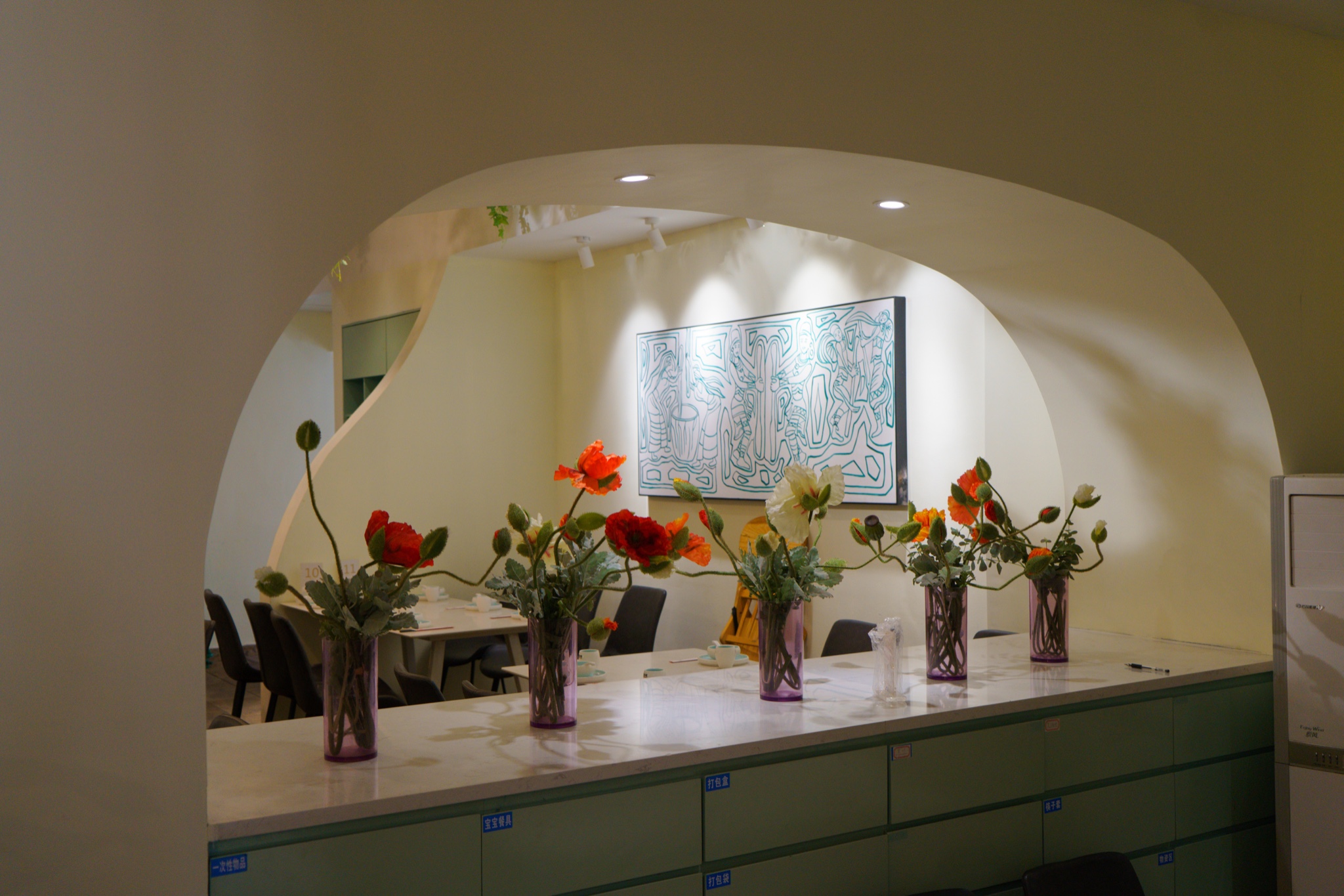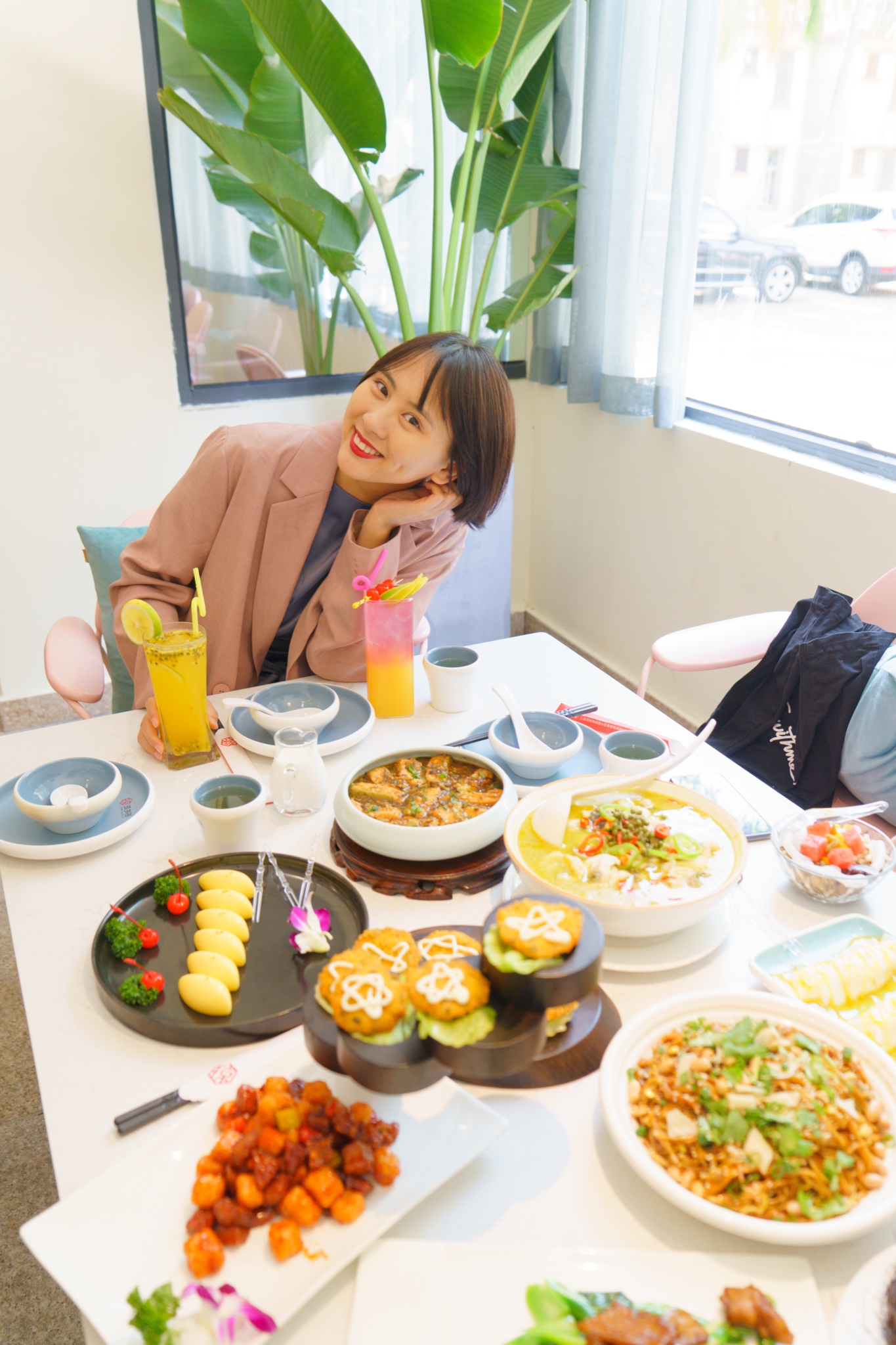 店内整体以清新的白色为主调,以鲜花绿植作装饰,作为一家本地菜餐厅,环境胜过不少专做网红打卡的下午茶餐厅。而我们刚好坐在靠窗的位置,窗外恰是正午时分,精神的阳光与茂绿的行道树,所以就餐环境很重要,眼前的一切令人心情舒畅,胃口仿佛也跟着变好了。两面大大的玻璃窗,阳光正好透过白纱窗散进来,作为自拍光线也特别的好~