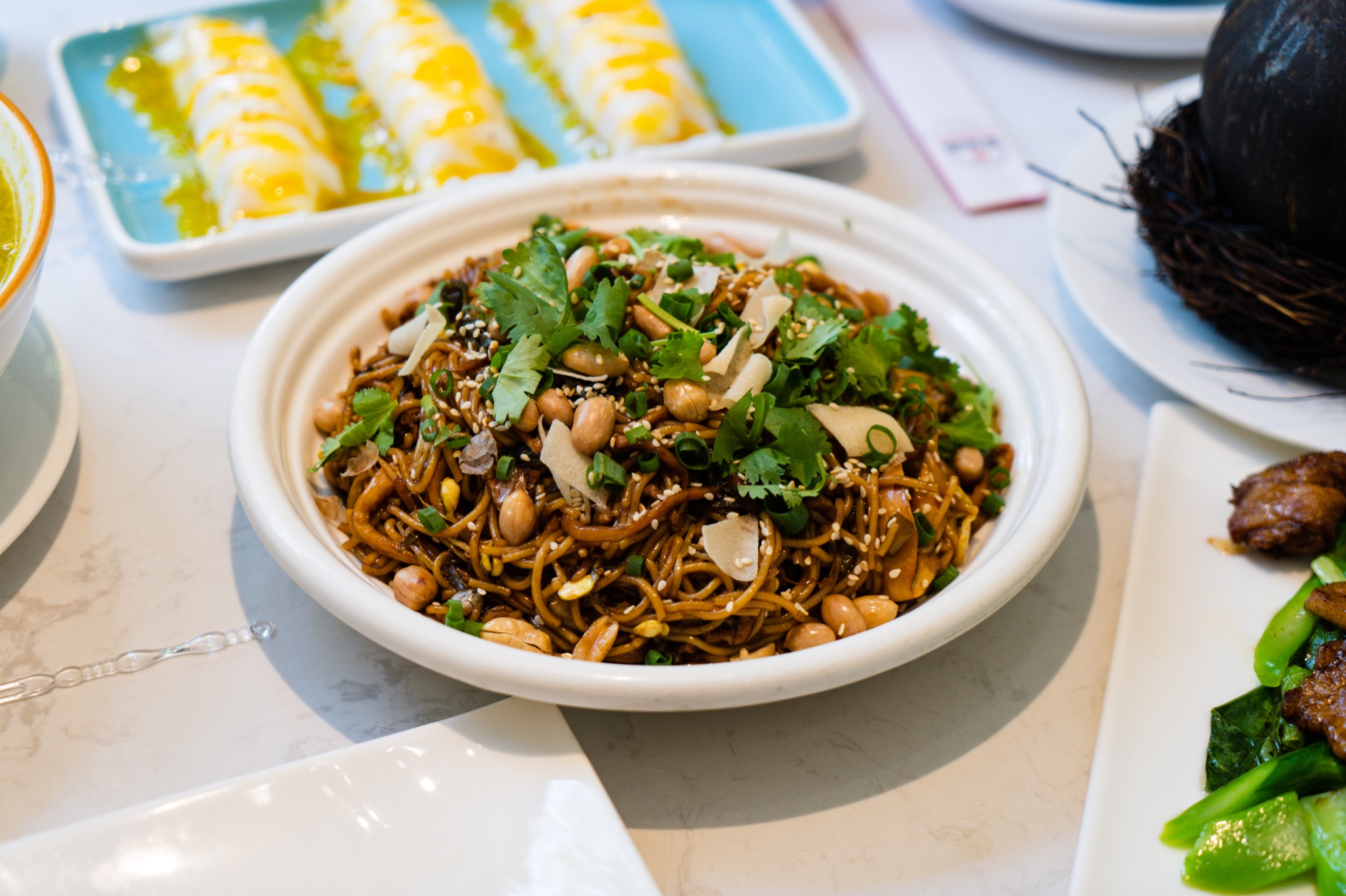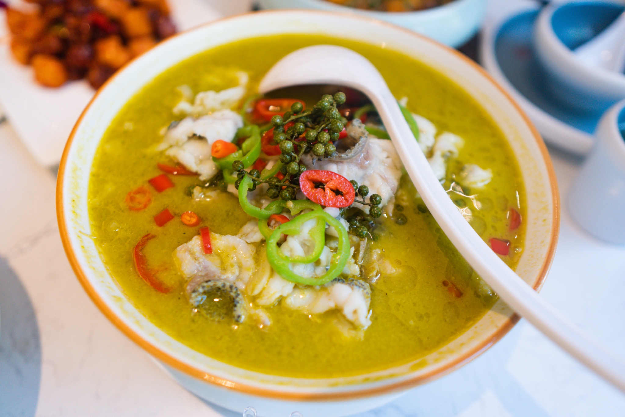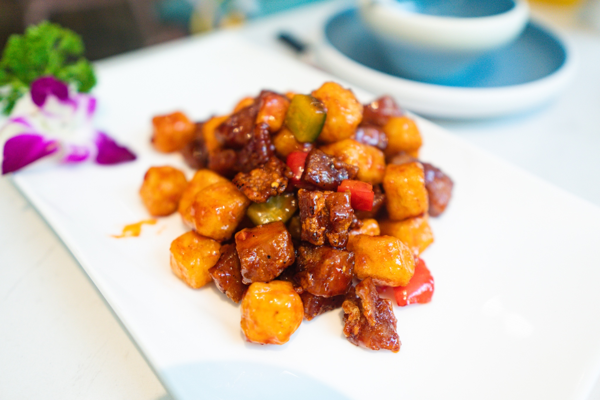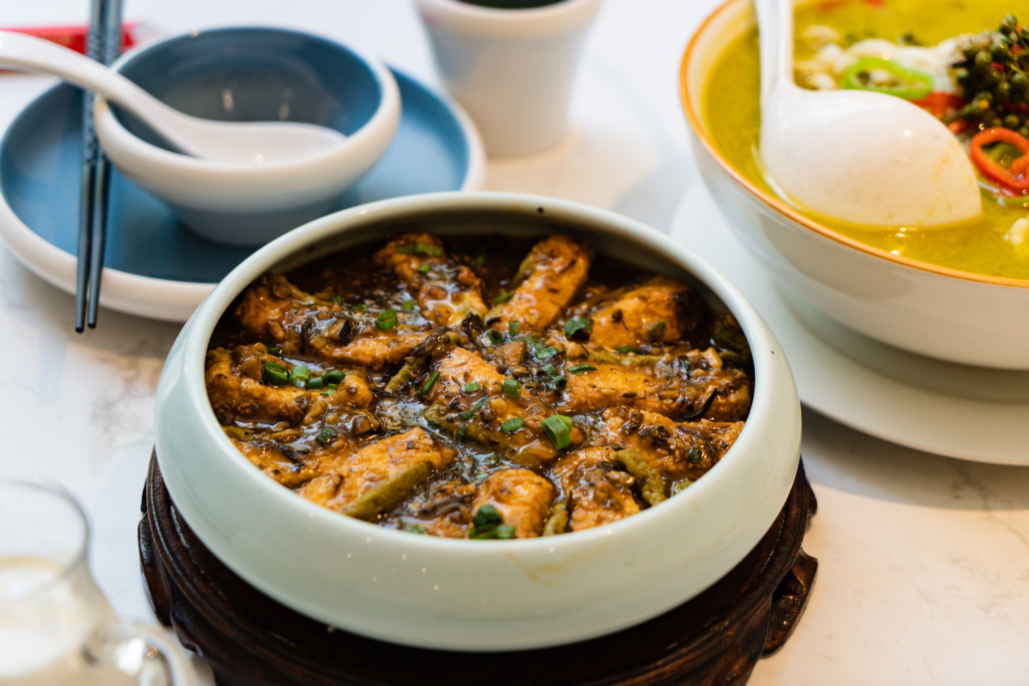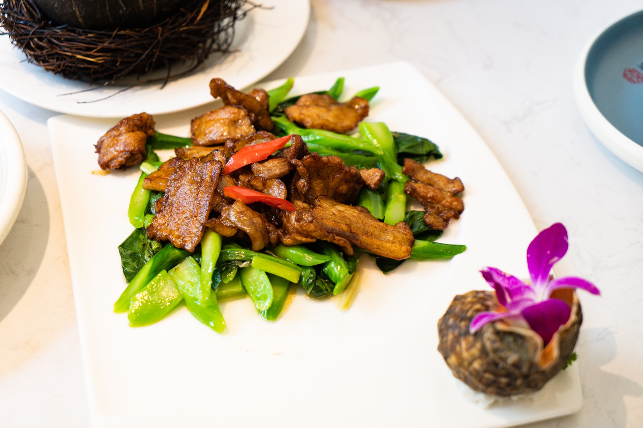 自拍得差不多,菜品也开始上桌,螺旋式摆盘的墨鱼饼,首先就让人眼前一亮。青花椒石斑鱼、阿婆手工豆腐、招牌海南粉、黑猪肉炒芥蓝、山药熘猪颈肉、椰子鸡汤…满满一桌地道又新颖的海南菜。说说石斑鱼,青花椒让我怀念起家乡的味道,但是经过改良,味道没那么重,更为清爽,适合更多可以尝试吃点麻辣的朋友。手工豆腐是店里的人气王,味道可想而知,手工制造出的豆腐,口感细嫩没得说,经过秘酱焖制而成,每一块豆腐都均匀入味,时下饭菜首选。