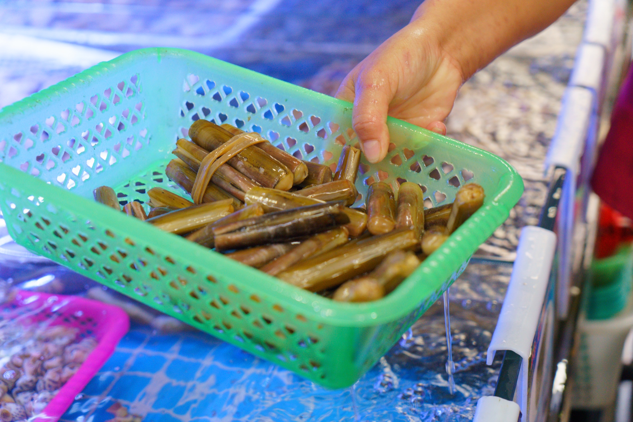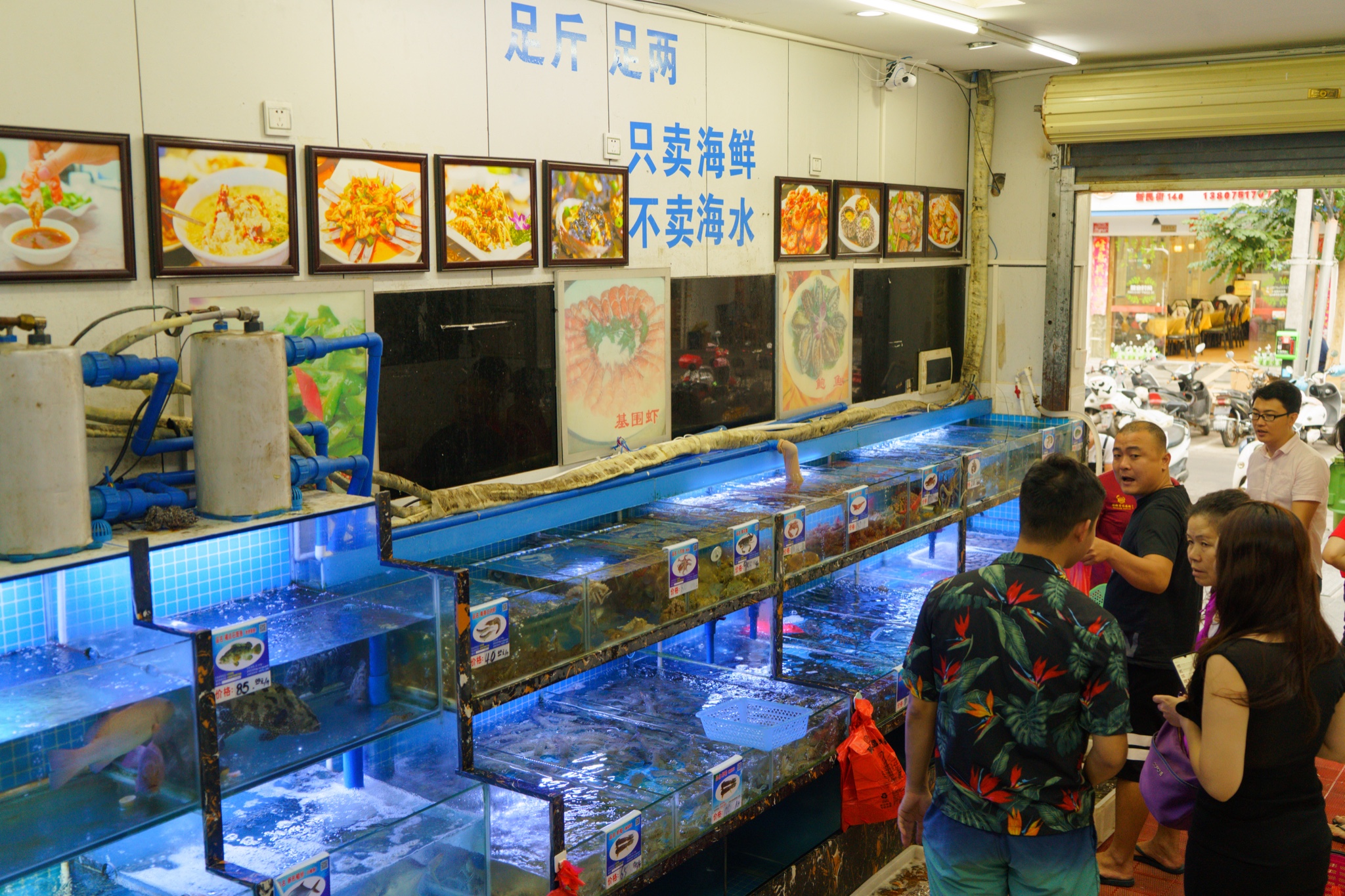 林姐在当地已经开了几十年,口碑一直都很好,别看店面小,其实有两层!而且方便客人挑选食材,有一间店面专门养海鲜,当然也可以到第一市场去转,但其实去了就发现,林姐这里的品种已经十分齐全了,开始不觉得,挑到后来上桌,一张大长桌堆堆叠叠都差点放不下。