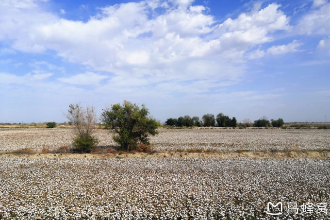 新疆长绒棉质量好,可见大片棉田。正好到收成季节,白茫茫一片。
