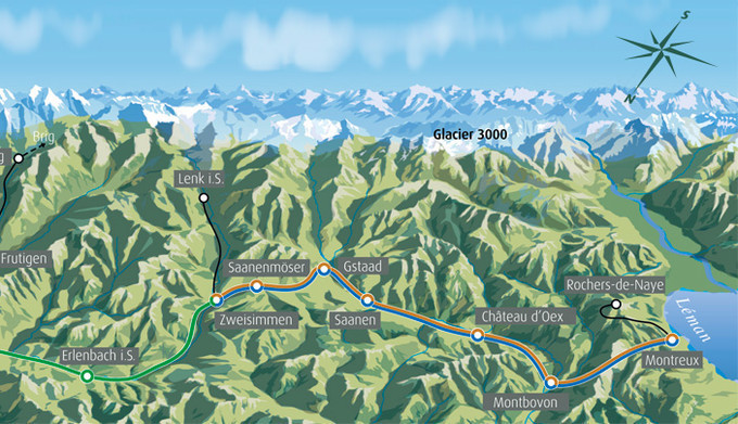 第三部分,从Zweisimmen这里,GoldenPass MOB Panoramic继续经Gstaad到位于日内瓦湖的蒙特勒。 这个壮观的冒险之旅可以在瑞士的西部或中部开始。最值得看的是琉森到因特拉肯这一段的风景。