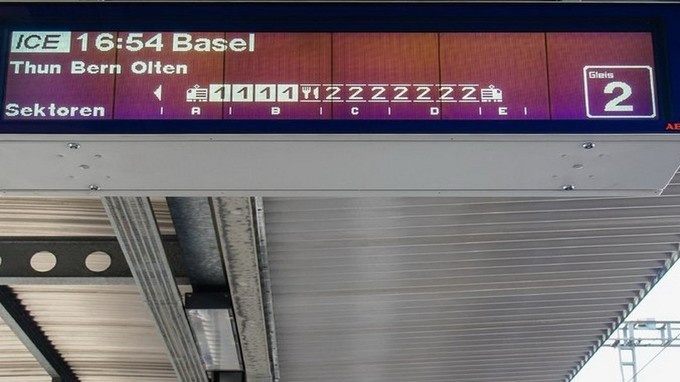 另外,在瑞士坐火车必须要注意看月台上方的显示屏,如上图中:第一行表示,此列车类型为ICE(城际特快列车,英文:Inter-City Express),16:54发车,终点站为Basel;第二行表示,中途将停Thun, Bern, Olten;第三、四行表示,月台A和E位置是火车头,B位置是1等车厢的候车区,C和D位置是2等车厢的候车区;右侧方框显示是该班列车停靠的将是2号站台。由于我们一般购买的是2等舱位的瑞士通票,所以在用SBB查好火车班次及确认列车停靠的站台后,就应当在这个站台电子显示牌所提示的2等车厢对应位置(如上图中的C和D区都是2等车厢)候车,以免误上1等车厢。