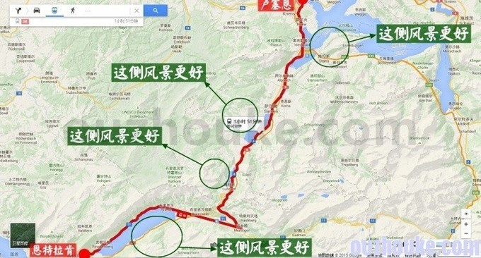 经常有人问,乘坐黄金线列车,从琉森到因特拉肯,坐在那一侧可以看到更多美景? 其实就是依次看四个湖区(Luzern, Brunnen, Lugern, Brienz Lakes)在列车行进路线的那一侧。下面这张示意图可以回答这个问题(也就是始末坐左侧,而中间坐右侧,比较合理。当然,中间两个湖区相对更为漂亮)。