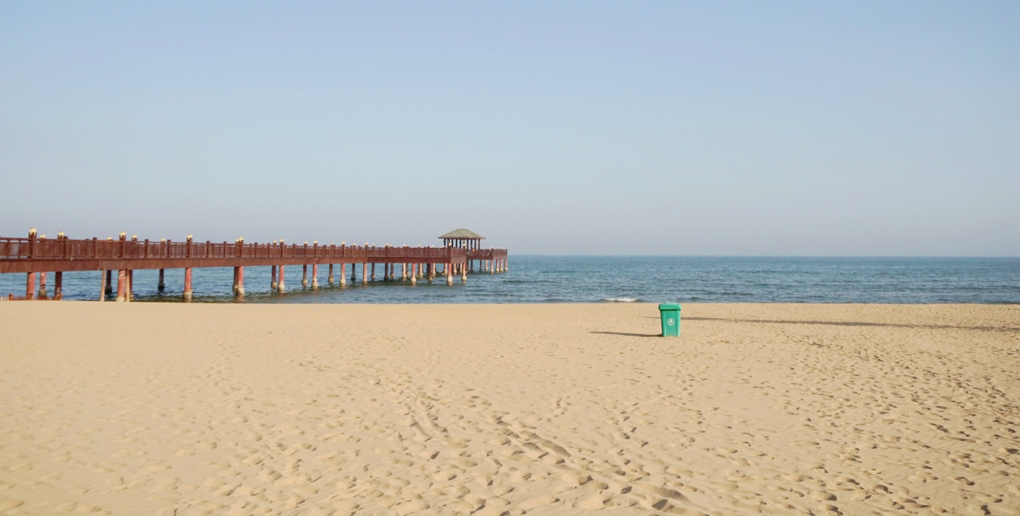 从住处步行蔚蓝海岸的海边约莫十五分钟,下午三点左右到的,此时的海滩上游客很少,大概二十人左右,真是包场的感觉,长长的木栈道延伸到海里,绿色垃圾桶俏皮又不合时宜地立在沙滩中央,海面有一些小浪花,岁月静好莫不如是。