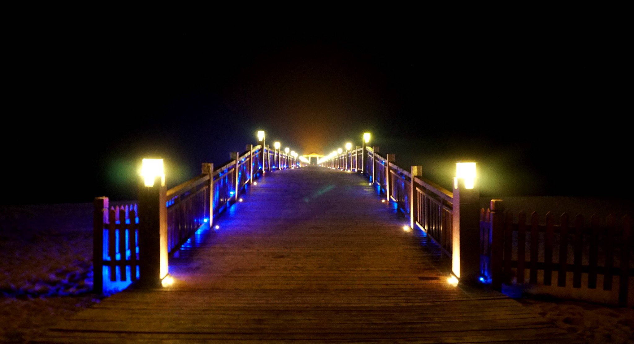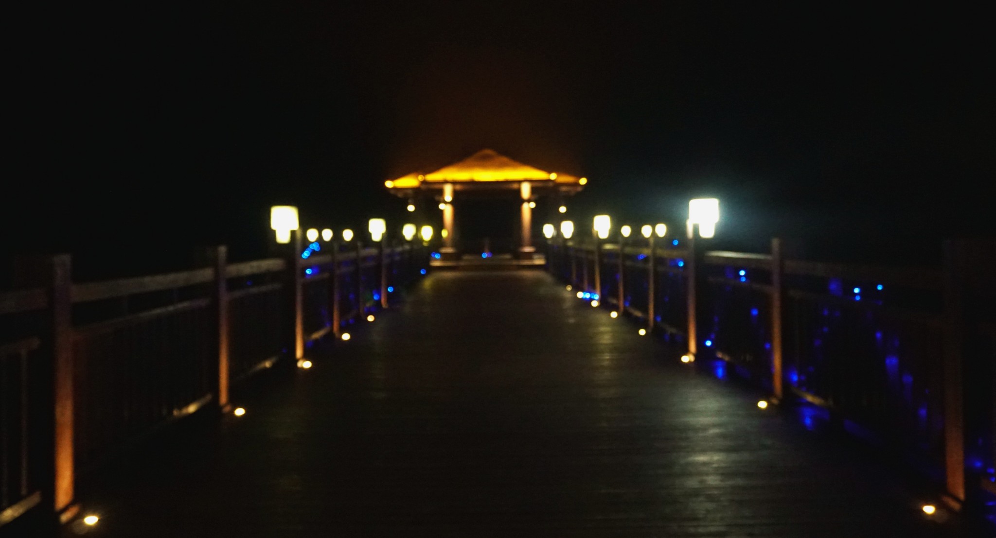 夜晚的栈道人气一落千丈,只有我与友人还试图边走边凹造型,当然以失败告终,栈道栏杆上的灯有拉低颜值的奇效,拍出来的面孔半明半暗,煞是诡异。