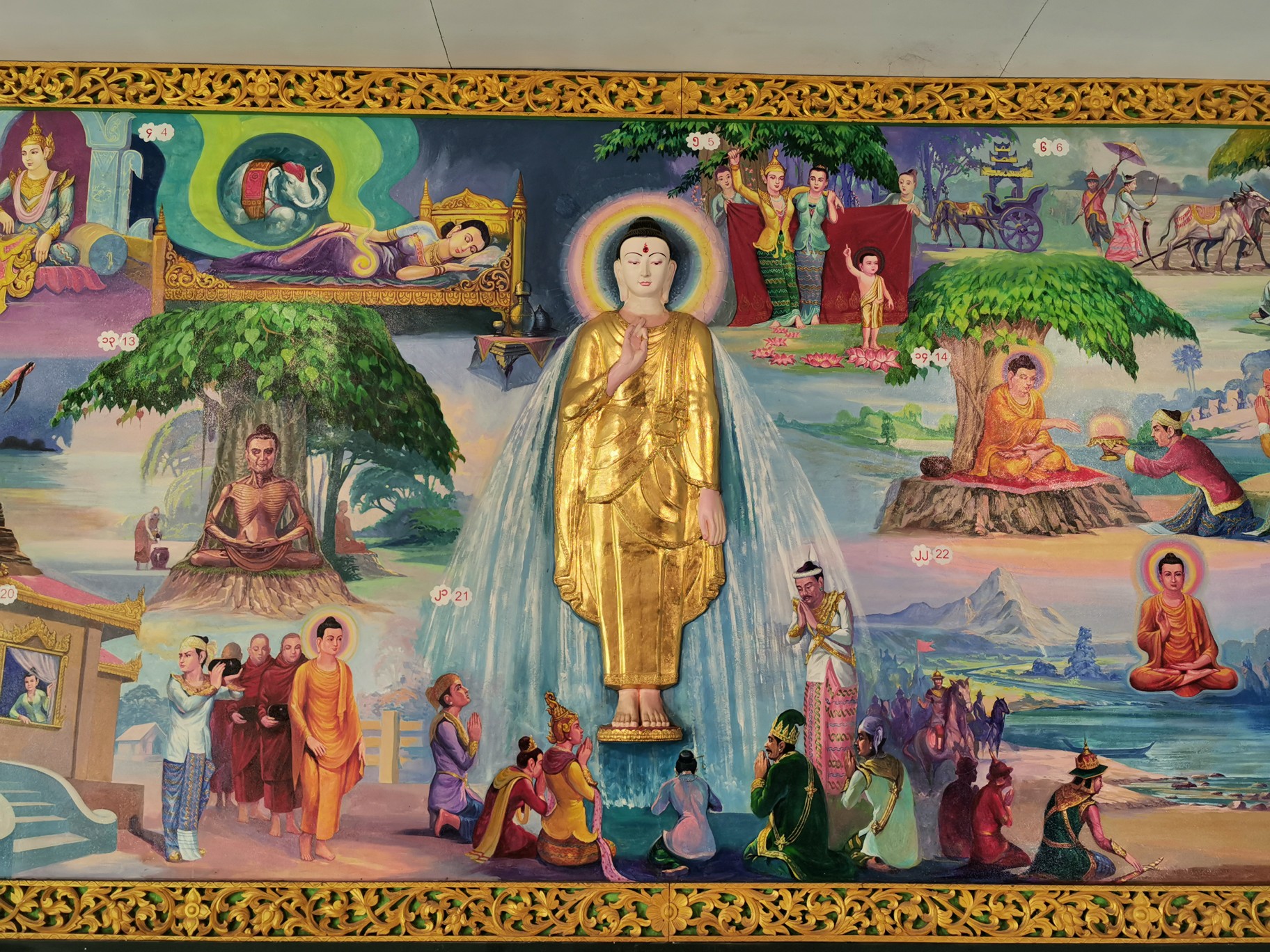 佛的大脚旁边有一系列画作,展示了成佛的过程