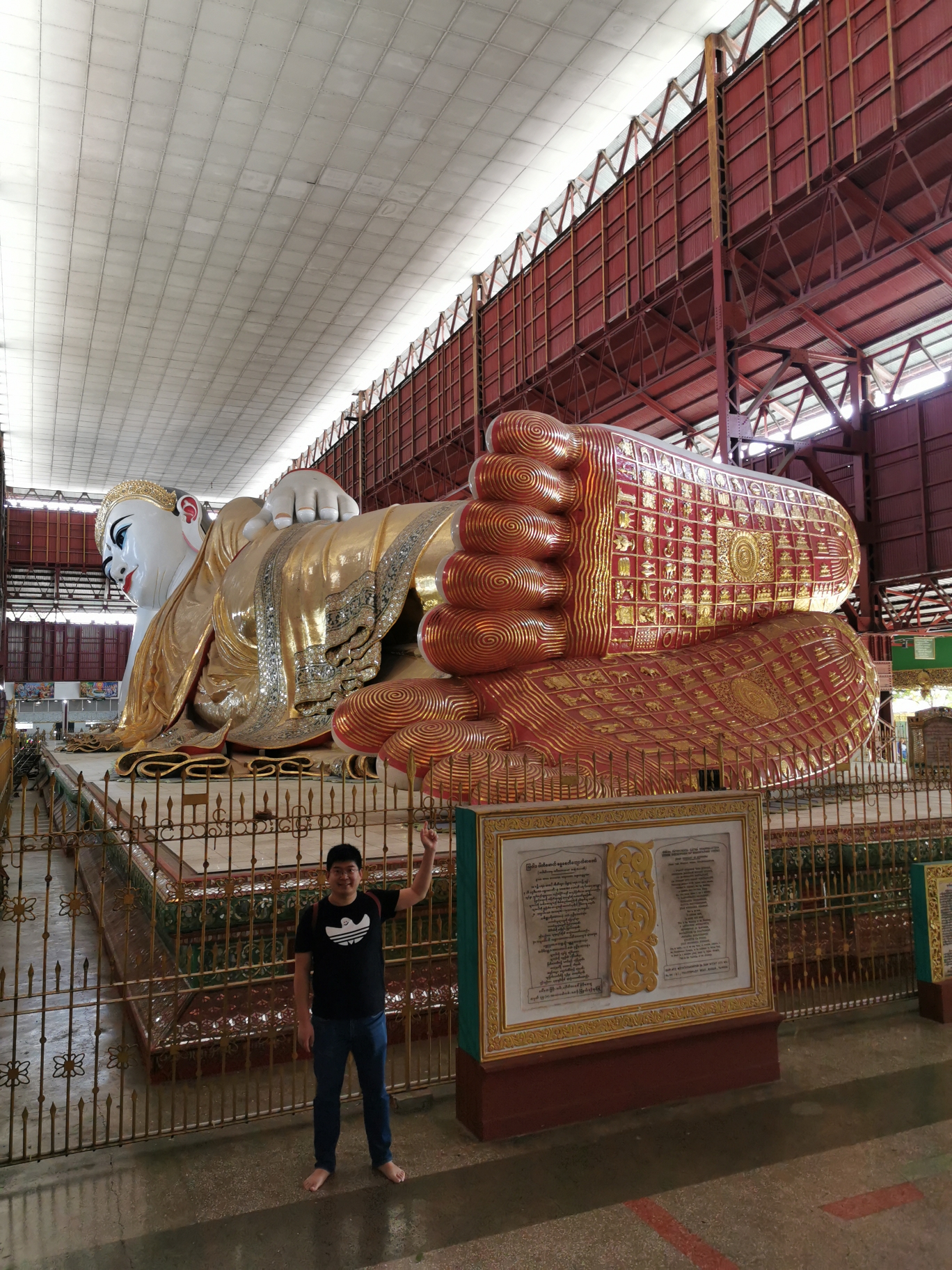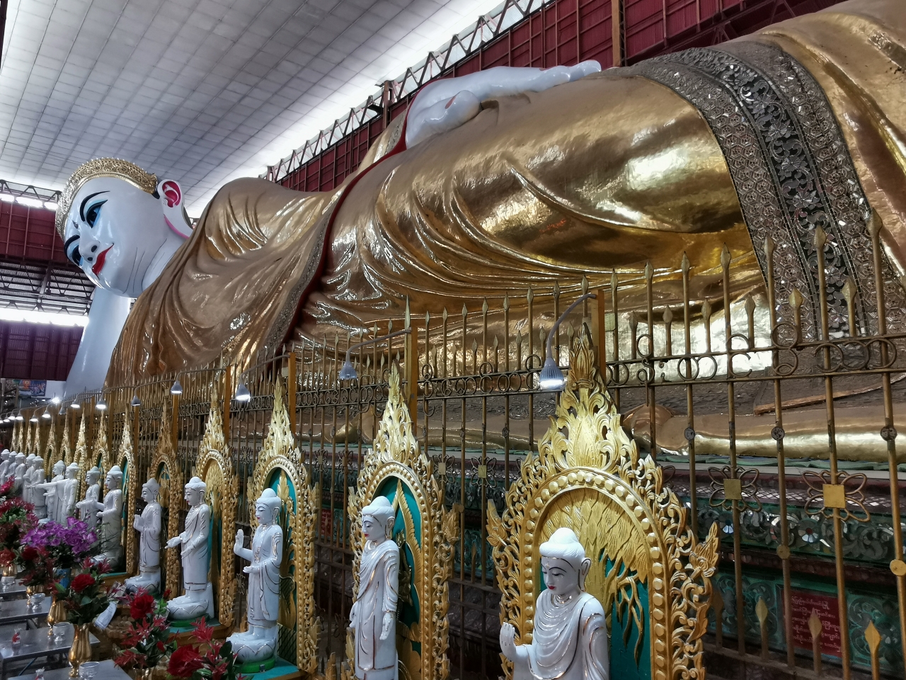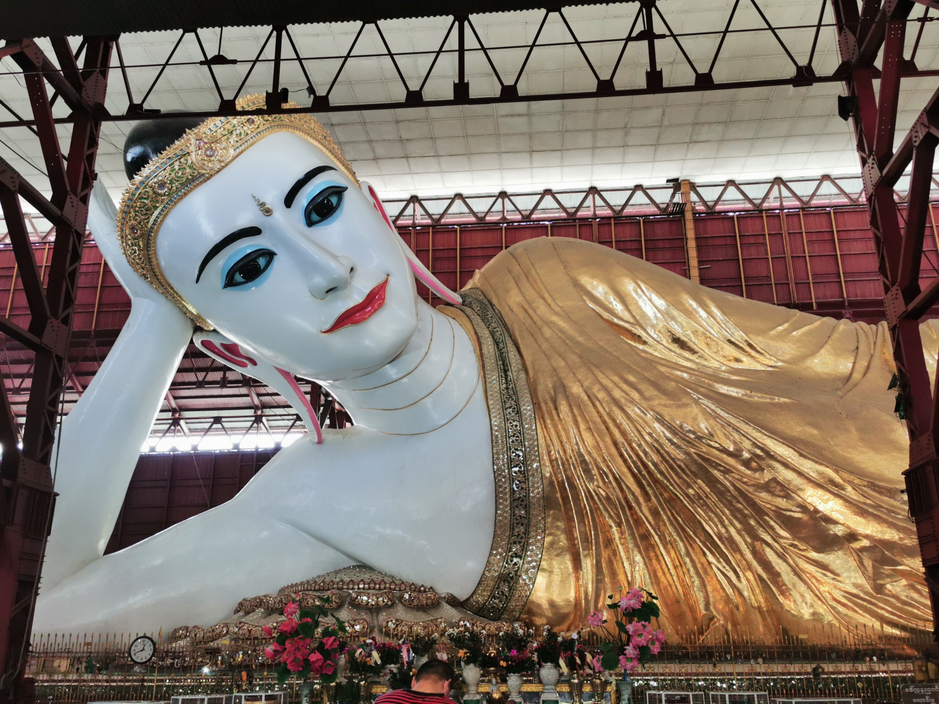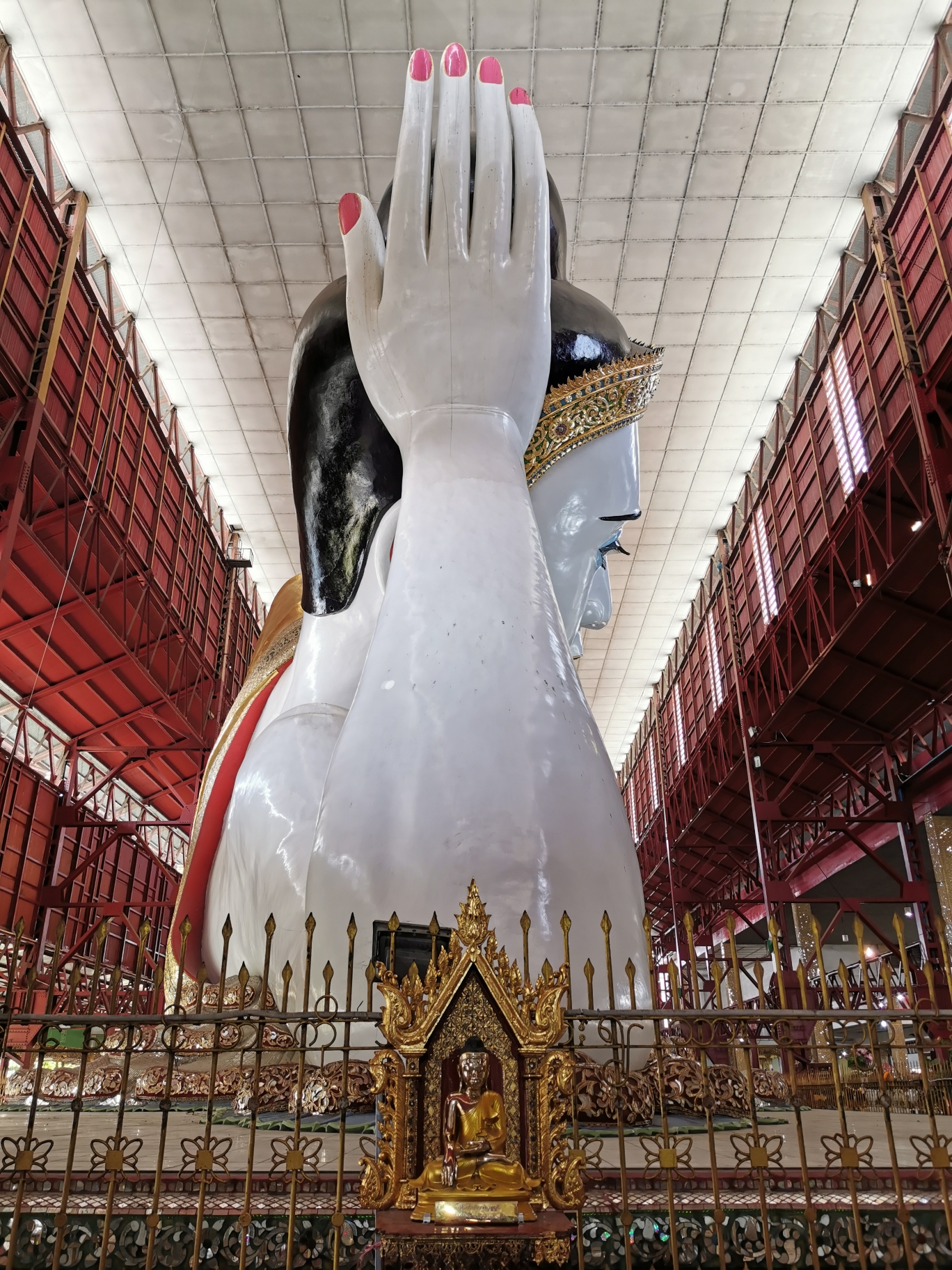 卧佛长20米,高5.4米,用了不少缅甸玉石和宝石。卧佛神态安详,眼睛由玻璃镶嵌而成,特别美丽。来自于那迦尔玻璃工厂。