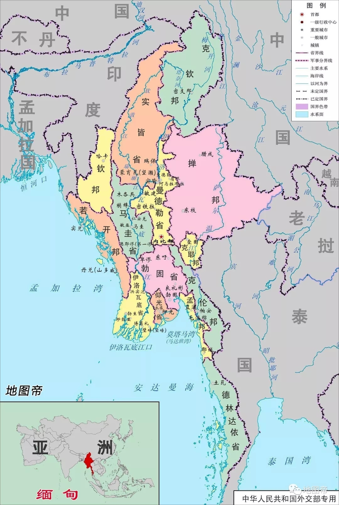 缅甸联邦共和国,中国史书汉称掸国,唐称骠国,宋称蒲甘,元称缅国,明始称缅甸。缅甸来自梵文“Brahma”。