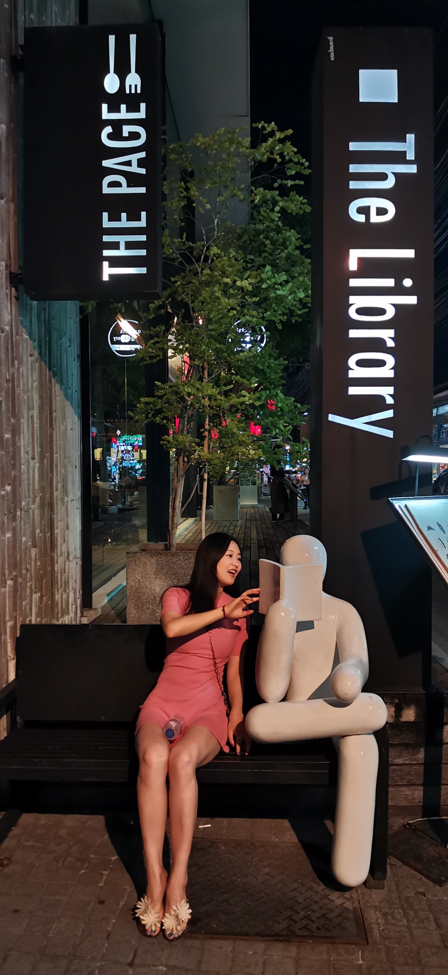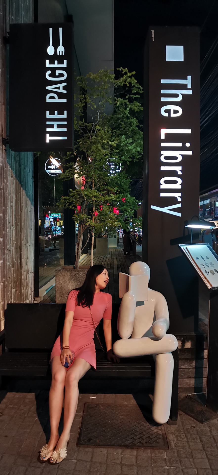 我们在查汶大街上很平价的My friend Massege(ps:这家超级推荐,除了环境一般,性价比、手法和服务挺不错的)按摩完以后,居然发现超级火的图书馆酒店就在正!对!面!只是我们不是住客,就不好意思进去看了,在外面陪凳子上孤独的阅读者拍拍照吧