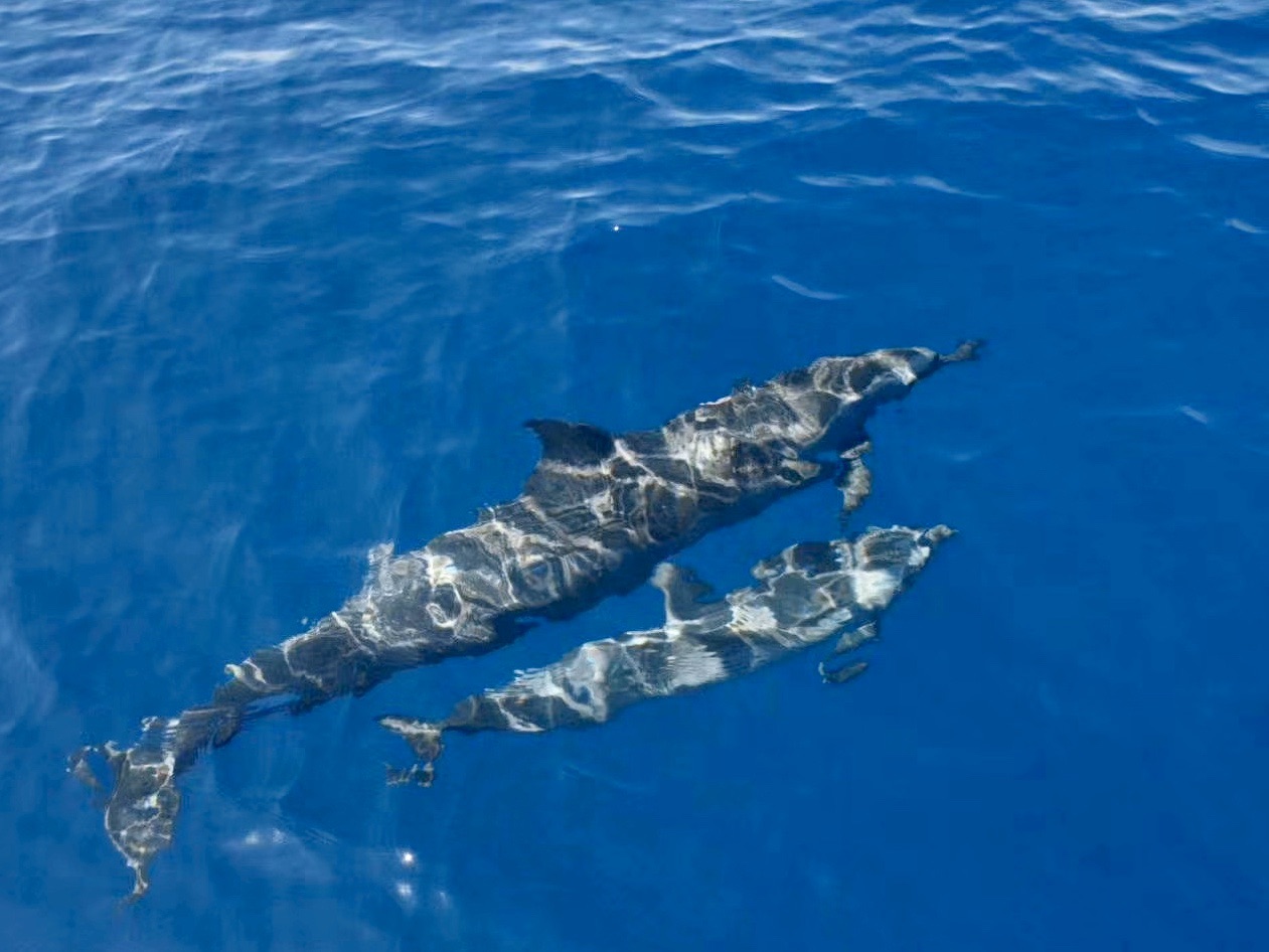 因为追海豚需要早起,所以我们早上5:30就起床了,6:30出发,要先坐小船,摆渡到一艘稍微大一点的螃蟹船上,然后坐着螃蟹船出海,出海大约一个多小时,就看到了海豚,海豚在我们的船头跳跃,帮我们带路,将我们引向更深的海域,然后我们就看到了成群结队的海豚在我们的周围,船上的每个人都非常激动。