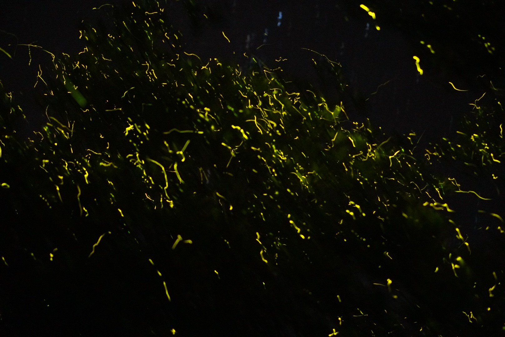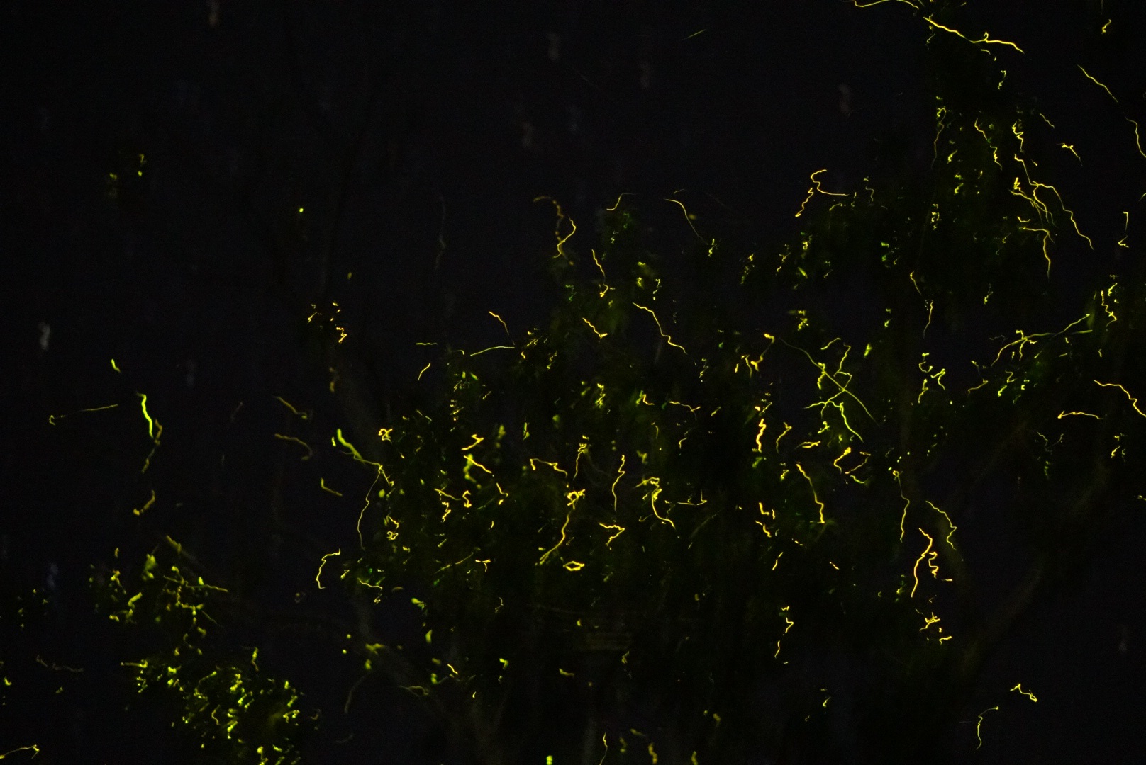 我们看到三棵树上有萤火虫,每一棵上面都挂着一闪一闪亮晶晶的萤火虫,比圣诞节的圣诞装饰树上的彩灯还要多。没有三脚架只能拍到这个程度了。