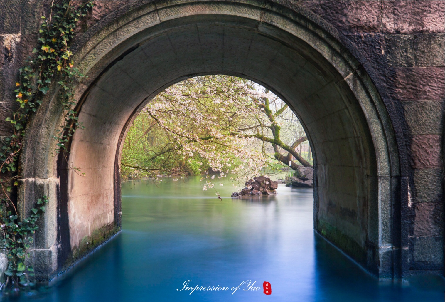 在太子湾的一处桥洞下,恰好能够窥见一株樱花,与一块礁石形成了绝美的构图。桥东下湖水清澈流动。如同一幅画,满是春天的气息。