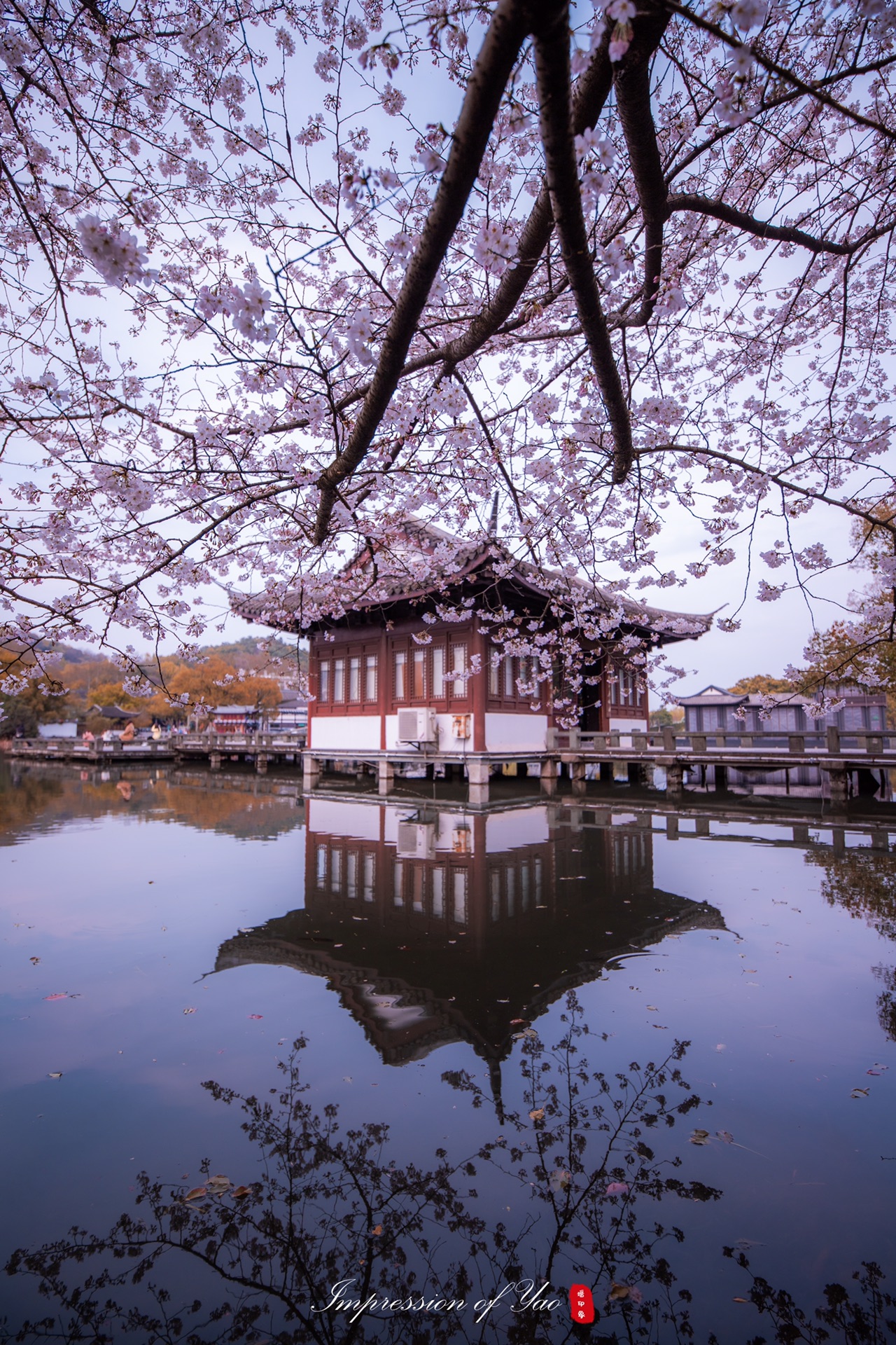 如果觉得太子湾人太多,那么曲院风荷绝对是赏樱的绝佳地。在这里也有一个拍摄樱花的热门机位,樱花与楼阁形成了彼此的呼应。从远处看,如云似霞般炫目,不时引来一只只彩蝶绕花盘旋,花掩蝶、蝶恋花,两种景物融为一体。每一朵樱花都透着春的气息,都带着光的明媚。走在樱花树下,就像走进了云层里,那纯白的花瓣编辑了梦想的温馨。