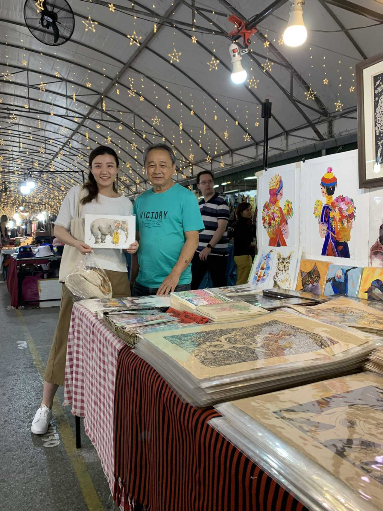 晚上两个人没事又开始逛长康路,跃跃欲试要杀价买东西,收获了在清迈的两件战利品,一个草编包和一副原创的水彩画。尤其是这幅水彩画,深得我心,卖画的老大爷也很可爱,跟他合影的时候他还偷偷踮脚哈哈。