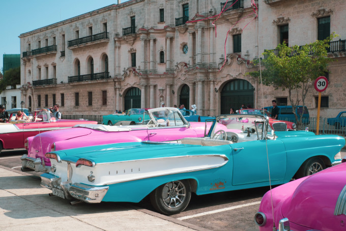 搭的士从机场到哈瓦那(大概是25 CUC),你会发现路上有很多很多的古董车。虽然是60年的古董,却都保养得非常好。他们颜色鲜艳,非常有线条,而且路上很多都是敞篷的款式。红的。纷红的。粉紫的,宝蓝色的,载着游客在街头飞奔总是那么的吸睛。我想:明天一定要租一辆到海滨大道去吹风。在酒店附近都会泊满了古董车,如果你想站在旁边拍照,司机都很友善的。