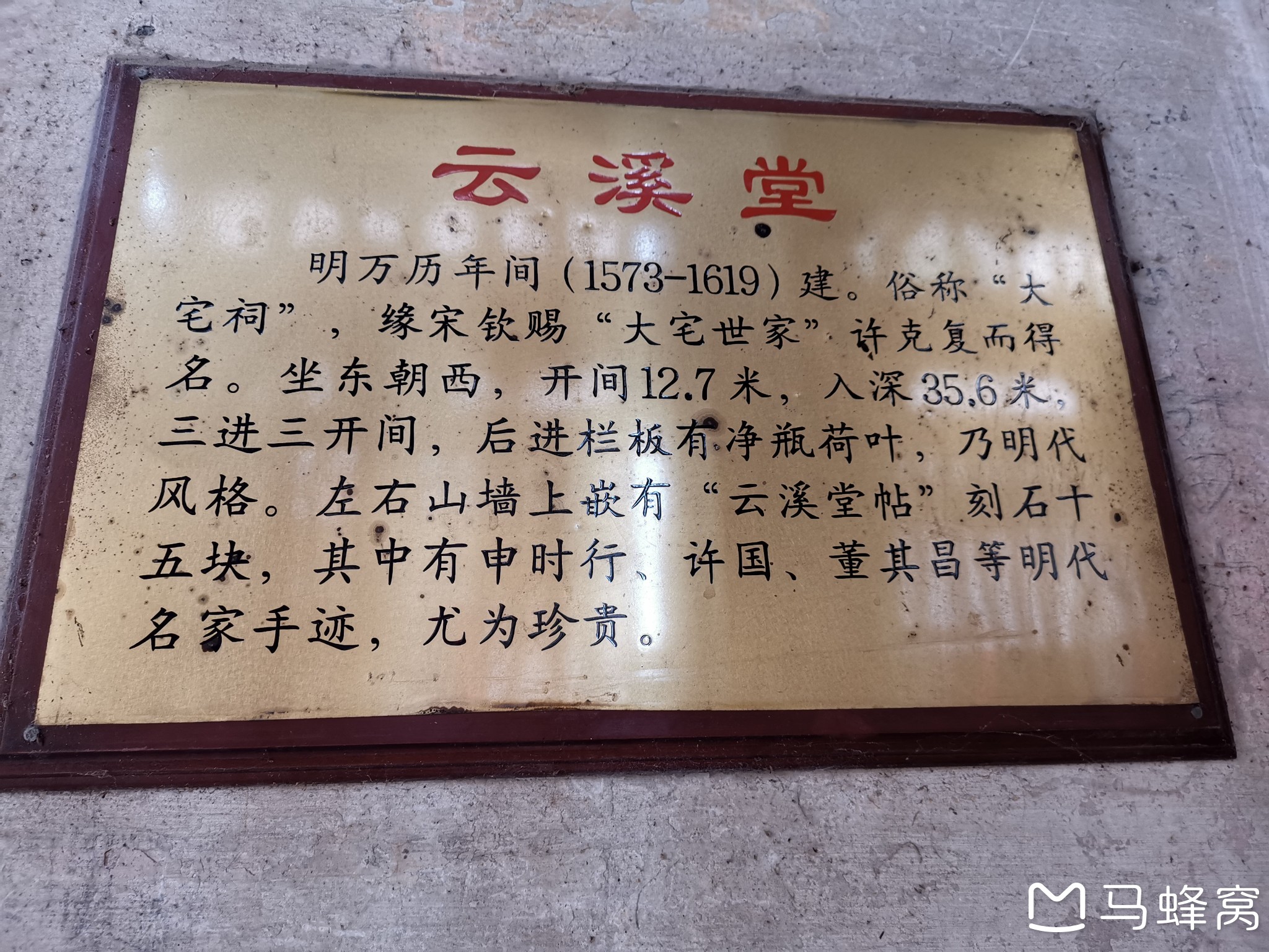 大宅祠因宋仁宗钦赐“大宅世家”给许村人许克复而得名,属许氏宗祠的一个支祠。坐东朝西,开间12.7米,入深35.6米,三进三开间,后进栏板有净瓶荷叶,乃明代风格。左右山墙上嵌有“云溪堂帖”刻石十五块,所以又称云溪堂其中有申时行、许国、董其昌等明代名家手迹,尤值称道。传说宋仁宗庆历年间,西夏入侵,宋军战败,这时,大宅门一富商许克复站出来,愿为朝庭分忧,资助军饷,后宋军胜,宋仁宗为嘉其义举,钦赐许克复为“大宅世家”。