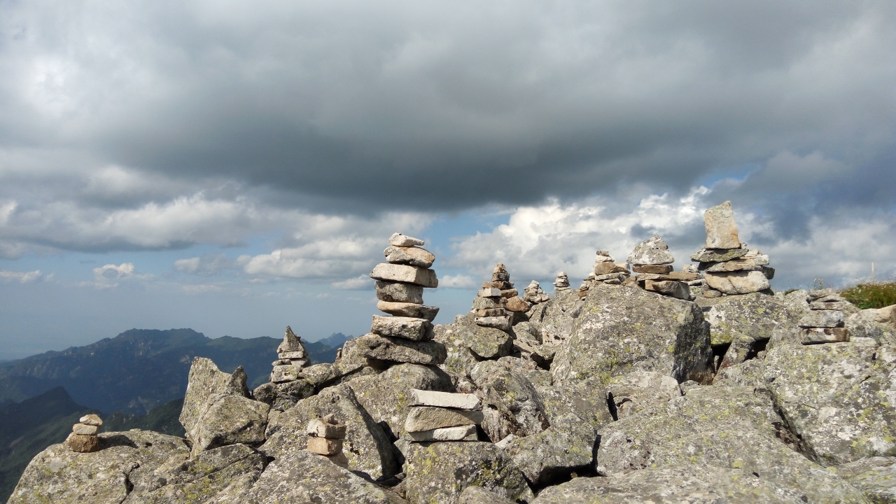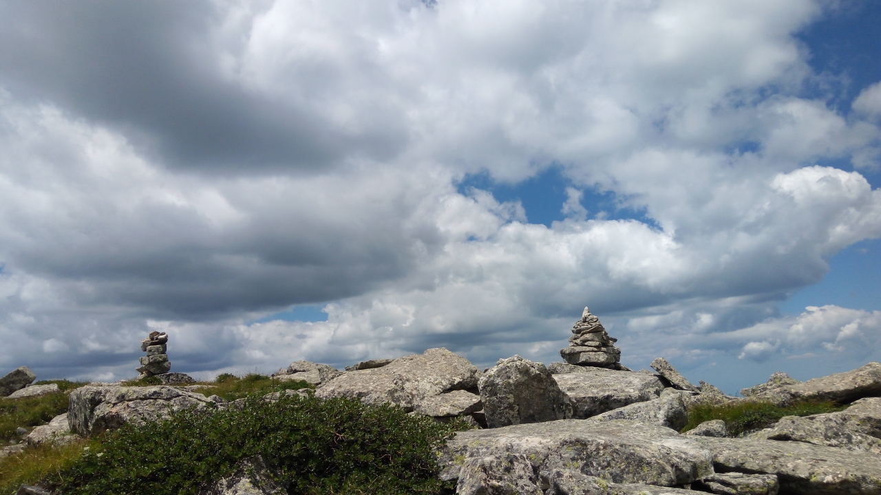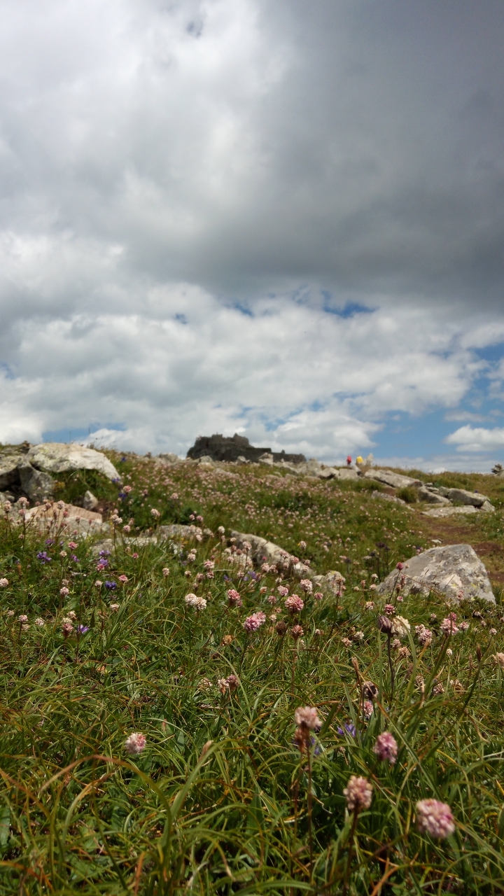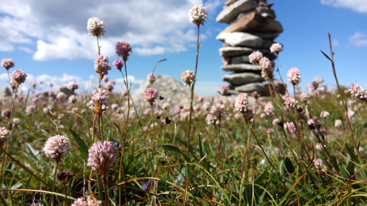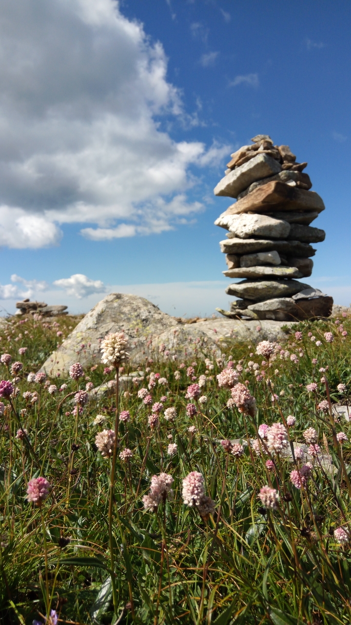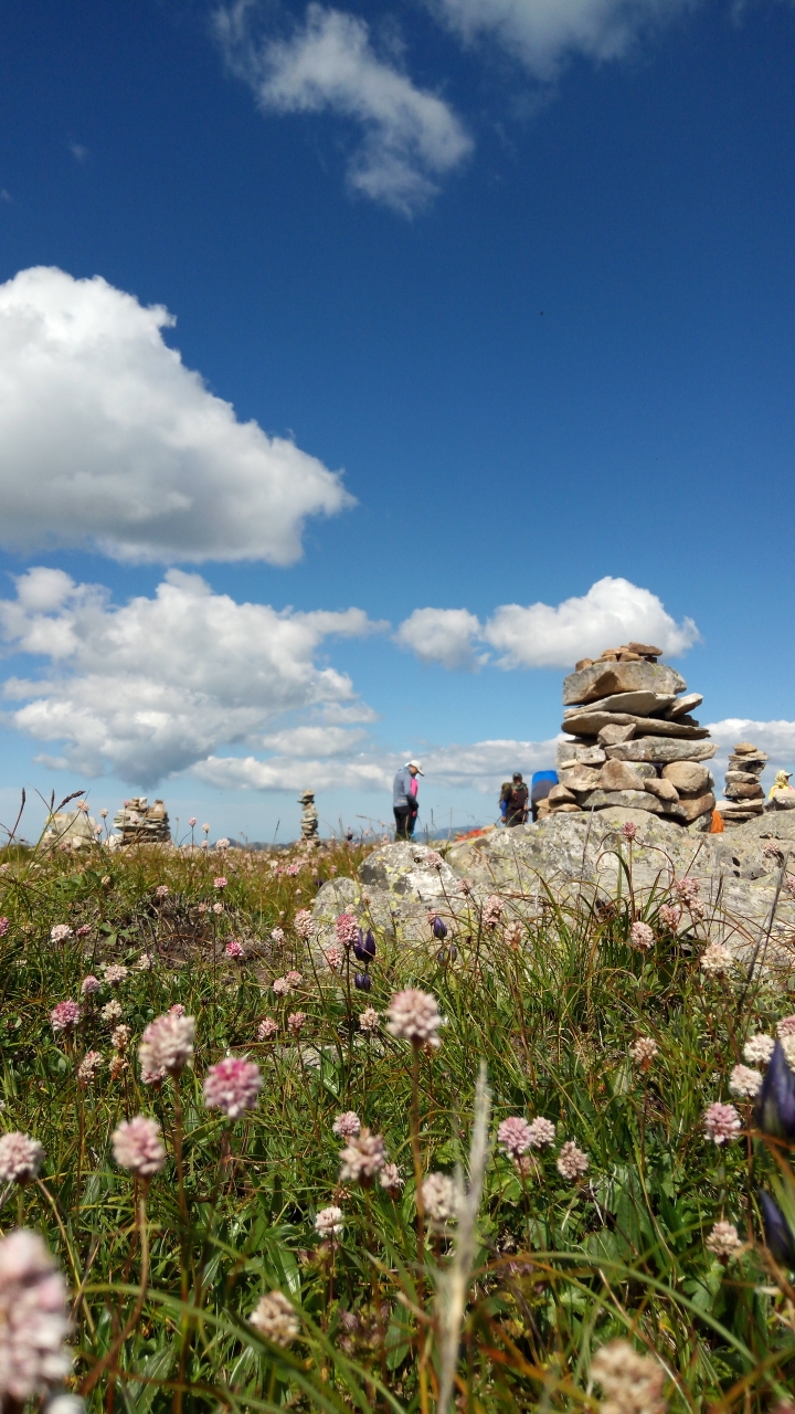 今天的云很多,站在万仙阵上,仿佛伸手就是天一般,剪一片云彩在手上,两只小鸭子跃然眼前,一条长龙横卧山前……云彩的样子随便咋想象都好。万仙阵上除了玛尼堆,最多的就是小野花了,各色花儿自开自好,因为鳌太的热门,让这些不知名的小花映衬在孤寂的线路上,并名扬户外圈。