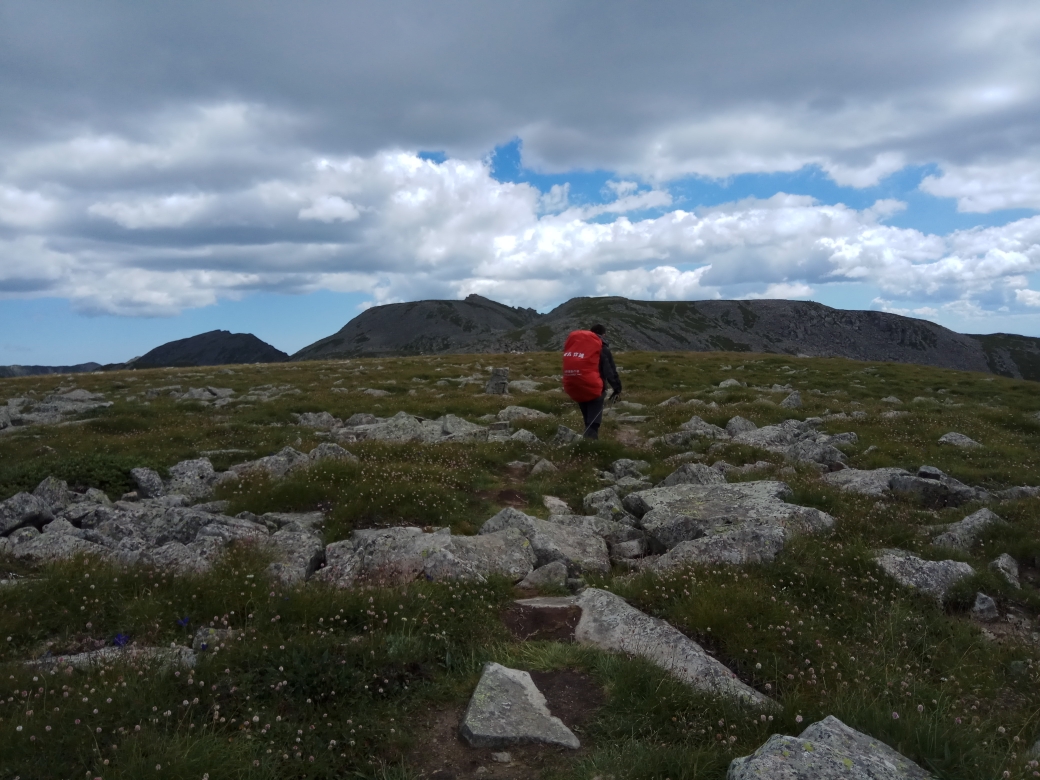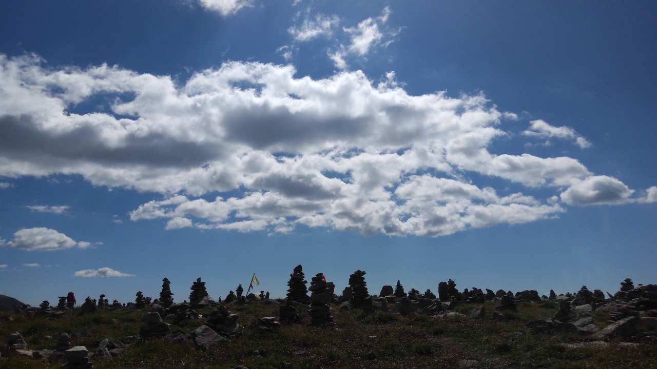 八点三十队伍准时出发登顶万仙阵,大石河营地海拔在3200米左右,万仙阵将近3600米,一路攀爬,感觉体能恢复不好,出发前特意和蛇哥要了点蛇粉,吃后头还有些疼,但明显好多了。一路攀升仍很困难,走一段歇一段,感觉上坡腿已经不属于自己,喘的都是粗气,不过经过一小时二十分钟还是登顶了万仙阵,上面有无数玛尼堆,我也在某一个玛尼堆上,摆上一颗石头,许下我的祝愿,之后拍照留念,欣赏漫步云端的曼妙。